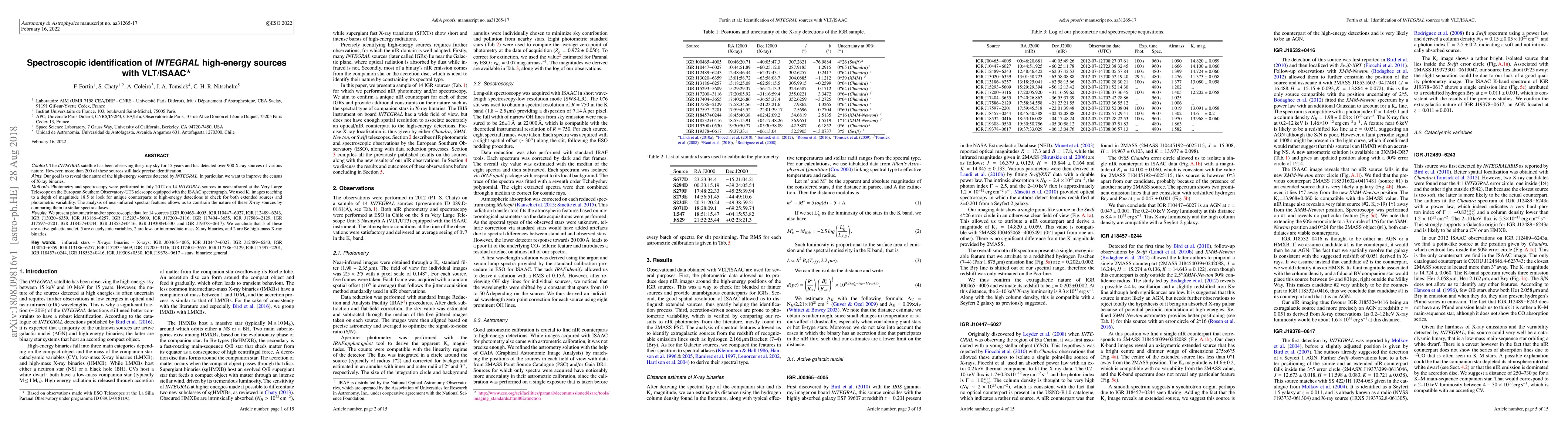 The INTEGRAL satellite has been observing the gamma-ray sky for 15 years and has detected over 900 X-ray sources of various nature. However, more than 200 of these sources still lack precise identification. Our goal is to reveal the nature of the high-energy sources detected by INTEGRAL. In particular, we want to improve the census of X-ray binaries. Photometry and spectroscopy were performed in July 2012 on 14 INTEGRAL sources in near-infrared at the Very Large Telescope on the European Southern Observatory-UT3 telescope equipped with the ISAAC spectrograph. We used K$_s$ images reaching to a depth of magnitude 18.5 to look for unique counterparts to high-energy detections to check for both extended sources and photometric variability. The analysis of near-infrared spectral features allows us to constrain the nature of these X-ray sources by comparing them to stellar spectra atlases. We present photometric and/or spectroscopic data for 14 sources (IGR J00465$-$4005, IGR J10447$-$6027, IGR J12489$-$6243, IGR J13020$-$6359, IGR J13186$-$6257, IGR J15293$-$5609, IGR J17200$-$3116, IGR J17404$-$3655, IGR J17586$-$2129, IGR J17597$-$2201, IGR J18457+0244, IGR J18532+0416, IGR J19308$+$0530, and IGR J19378$-$0617). We conclude that 5 of these are active galactic nuclei, 5 are cataclysmic variables, 2 are low- or intermediate-mass X-ray binaries, and 2 are Be high-mass X-ray binaries.