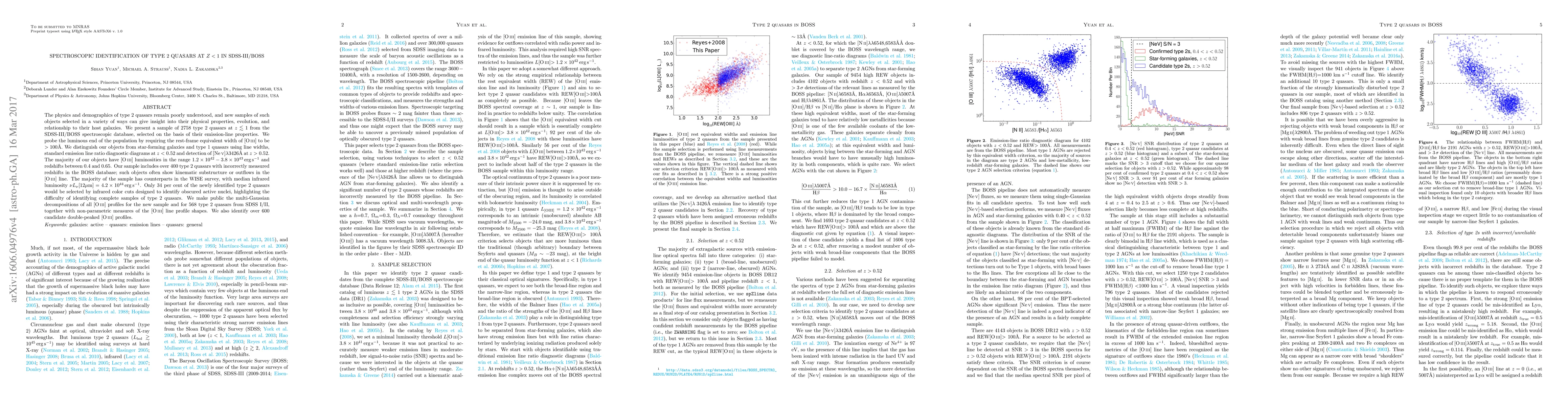 This paper identifies and characterizes a sample of 2758 type 2 quasars at redshifts less than 1 from the SDSS-III/BOSS data, using spectroscopic emission-line properties. The study highlights the difficulty in identifying complete samples of type 2 quasars using infrared color cuts.