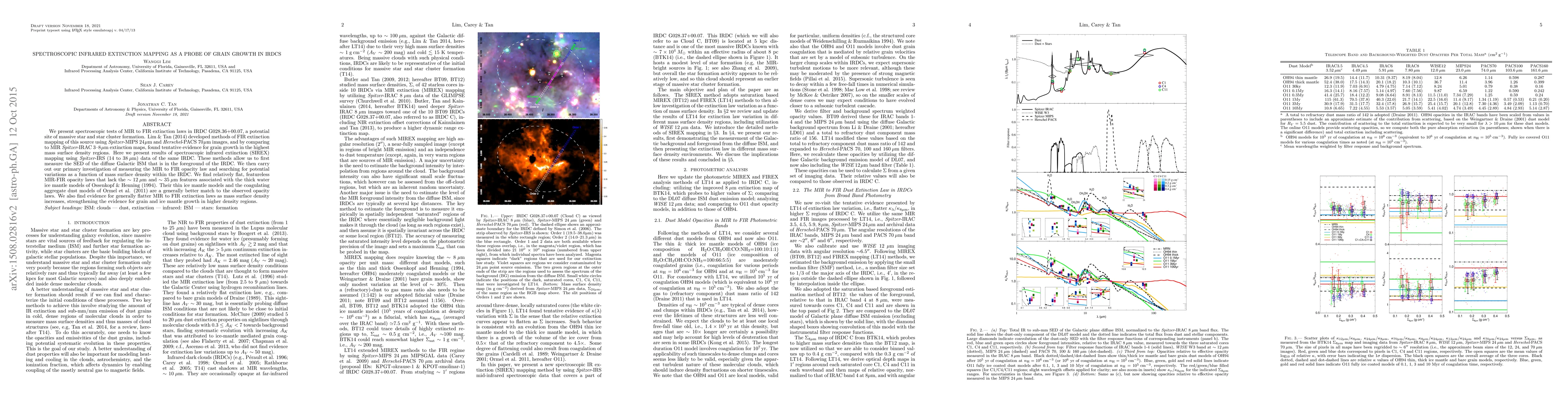 We present spectroscopic tests of MIR to FIR extinction laws in IRDC G028.36+00.07, a potential site of massive star and star cluster formation. Lim & Tan (2014) developed methods of FIR extinction mapping of this source using ${\it Spitzer}$-MIPS ${\rm 24\mu m}$ and ${\it Herschel}$-PACS ${\rm 70\mu m}$ images, and by comparing to MIR ${\it Spitzer}$-IRAC $3$--${\rm 8\mu m}$ extinction maps, found tentative evidence for grain growth in the highest mass surface density regions. Here we present results of spectroscopic infrared extinction (SIREX) mapping using ${\it Spitzer}$-IRS (14 to ${\rm 38\mu m}$) data of the same IRDC. These methods allow us to first measure the SED of the diffuse Galactic ISM that is in the foreground of the IRDC. We then carry out our primary investigation of measuring the MIR to FIR opacity law and searching for potential variations as a function of mass surface density within the IRDC. We find relatively flat, featureless MIR-FIR opacity laws that lack the $\sim{\rm 12\mu m}$ and $\sim{\rm 35\mu m}$ features associated with the thick water ice mantle models of Ossenkopf & Henning (1994). Their thin ice mantle models and the coagulating aggregate dust models of Ormel et al. (2011) are a generally better match to the observed opacity laws. We also find evidence for generally flatter MIR to FIR extinction laws as mass surface density increases, strengthening the evidence for grain and ice mantle growth in higher density regions.