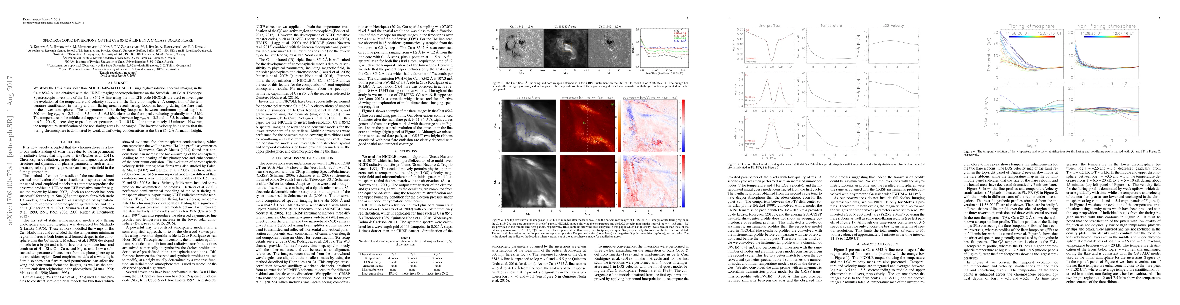 We study the C8.4 class solar flare SOL2016-05-14T11:34 UT using high-resolution spectral imaging in the Ca ii 8542 {\AA} line obtained with the CRISP imaging spectropolarimeter on the Swedish 1-m Solar Telescope. Spectroscopic inversions of the Ca ii 8542 {\AA} line using the non-LTE code NICOLE are used to investigate the evolution of the temperature and velocity structure in the flare chromosphere. A comparison of the temperature stratification in flaring and non-flaring areas reveals strong footpoint heating during the flare peak in the lower atmosphere. The temperature of the flaring footpoints between continuum optical depth at 500~nm, $\mathrm{log~\tau_{500}~\approx -2.5~and~ -3.5}$ is $\mathrm{\sim5-6.5~kK}$, close to the flare peak, reducing gradually to $\mathrm{\sim5~kK}$. The temperature in the middle and upper chromosphere, between $\mathrm{log~\tau_{500} \approx - 3.5~and~- 5.5}$, is estimated to be $\mathrm{\sim6.5 - 20~kK}$, decreasing to pre-flare temperatures, $\mathrm{\sim5 - 10~kK}$, after approximately 15 minutes. However, the temperature stratification of the non-flaring areas is unchanged. The inverted velocity fields show that the flaring chromosphere is dominated by weak downflowing condensations at the Ca ii 8542 {\AA} formation height.