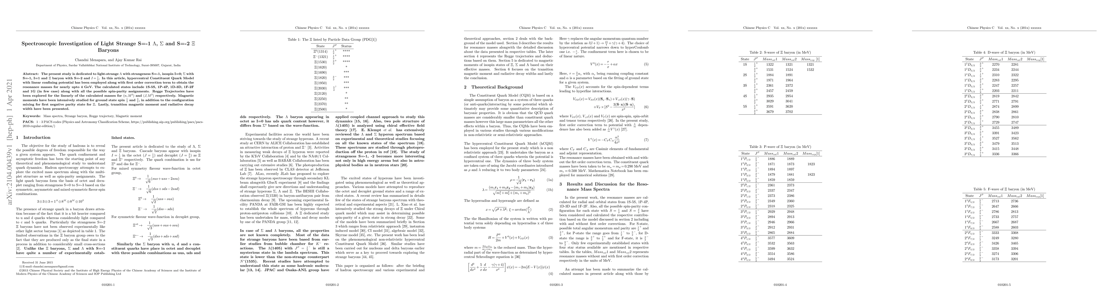 The present study is dedicated to light-strange $\Lambda$ with strangeness S=-1, isospin I=0; $\Sigma$ with S=-1, I=1 and $\Xi$ baryon with S=-2 and $I=\frac{1}{2}$. In this article, hypercentral Constituent Quark Model with linear confining potential has been employed along with first order correction term to obtain the resonance masses for nearly upto 4 GeV. The calculated states include 1S-5S, 1P-4P, 1D-3D, 1F-2F and 1G (in few case) along with all the possible spin-parity assignments. Regge Trajectories have been explored for the linearly of the calculated masses for $(n,M^{2})$ and $(J,M^{2})$ respectively. Magnetic moments have been intensively studied for ground state spin $\frac{1}{2}$ and $\frac{3}{2}$, in addition to the configuration mixing for first negative parity state for $\Xi$. Lastly, transition magnetic moment and radiative decay width have been presented.