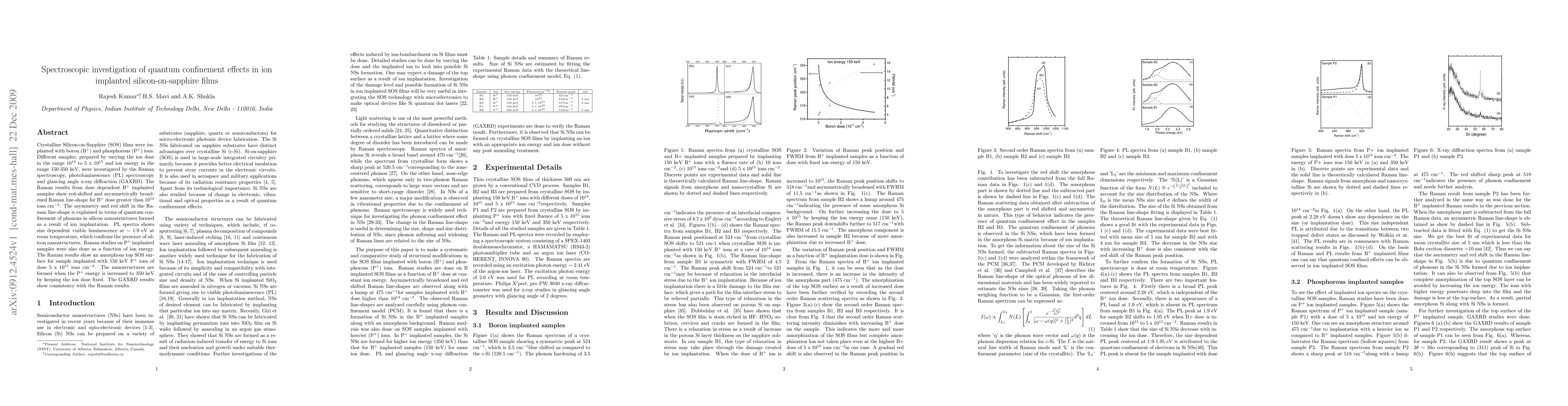 This paper investigates quantum confinement effects in ion-implanted silicon-on-sapphire (SOS) films using Raman, photoluminescence, and x-ray diffraction techniques. Results show red-shifted and broadened Raman lines due to phonon confinement in silicon nanostructures formed by boron implantation, while visible luminescence confirms the presence of these nanostructures.