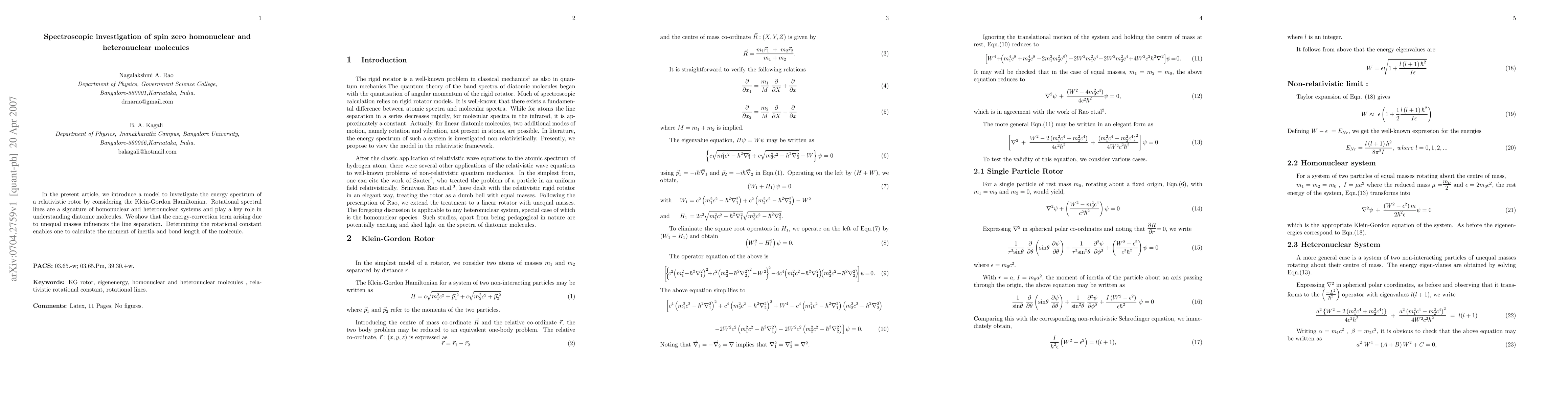 In the present article, we introduce a model to investigate the energy spectrum of a relativistic rotor by considering the Klein-Gordon Hamiltonian. Rotational spectral lines are a signature of homonuclear and heteronuclear systems and play a key role in understanding diatomic molecules. We show that the energy-correction term arising due to unequal masses influences the line separation. Determining the rotational constant enables one to calculate the moment of inertia and bond length of the molecule.