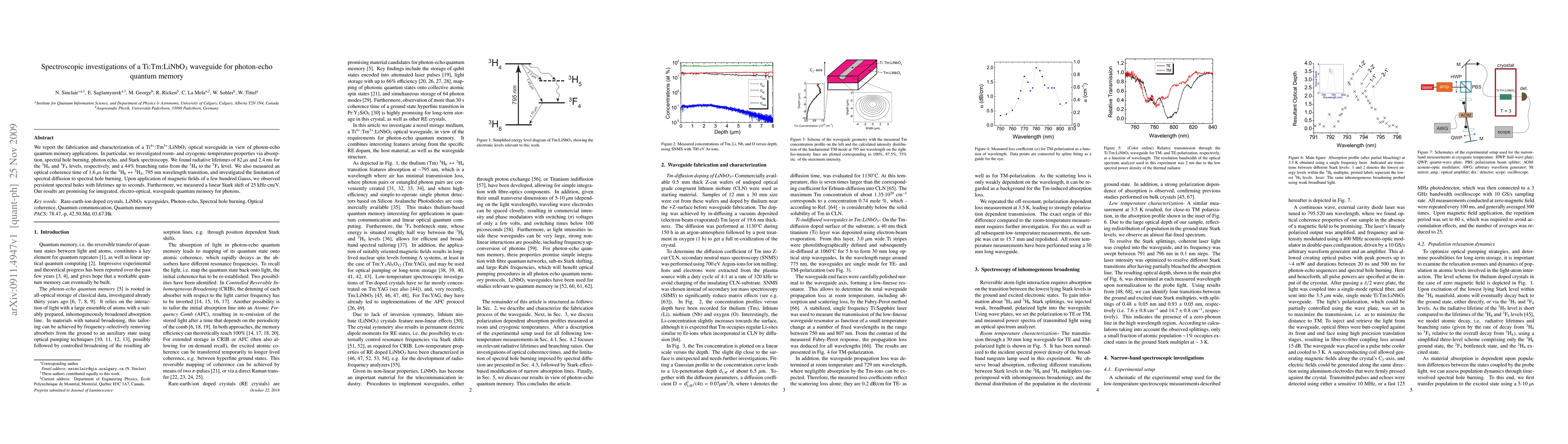 Researchers created a Ti:Tm:LiNbO3 waveguide for quantum memory applications and found promising properties, including radiative lifetimes of 82 microseconds and 2.4 milliseconds for specific energy levels.