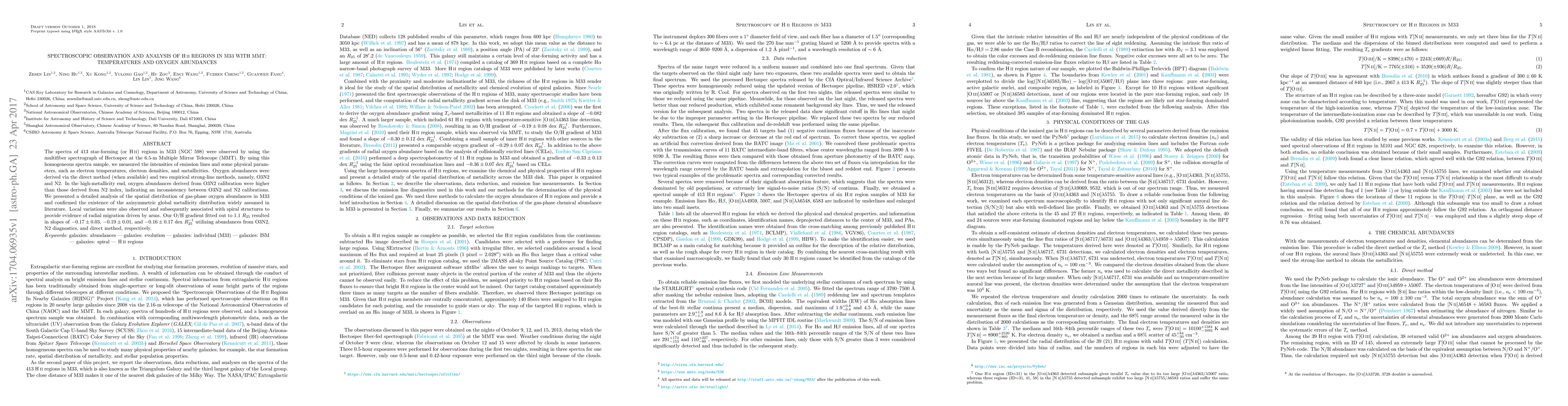 The spectra of 413 star-forming (or HII) regions in M33 (NGC 598) were observed by using the multifiber spectrograph of Hectospec at the 6.5-m Multiple Mirror Telescope (MMT). By using this homogeneous spectra sample, we measured the intensities of emission lines and some physical parameters, such as electron temperatures, electron densities, and metallicities. Oxygen abundances were derived via the direct method (when available) and two empirical strong-line methods, namely, O3N2 and N2. In the high-metallicity end, oxygen abundances derived from O3N2 calibration were higher than those derived from N2 index, indicating an inconsistency between O3N2 and N2 calibrations. We presented a detailed analysis of the spatial distribution of gas-phase oxygen abundances in M33 and confirmed the existence of the axisymmetric global metallicity distribution widely assumed in literature. Local variations were also observed and subsequently associated with spiral structures to provide evidence of radial migration driven by arms. Our O/H gradient fitted out to 1.1 $R_{25}$ resulted in slopes of $-0.17\pm0.03$, $-0.19\pm0.01$, and $-0.16\pm0.17$ dex $R_{25}^{-1}$ utilizing abundances from O3N2, N2 diagnostics, and direct method, respectively.