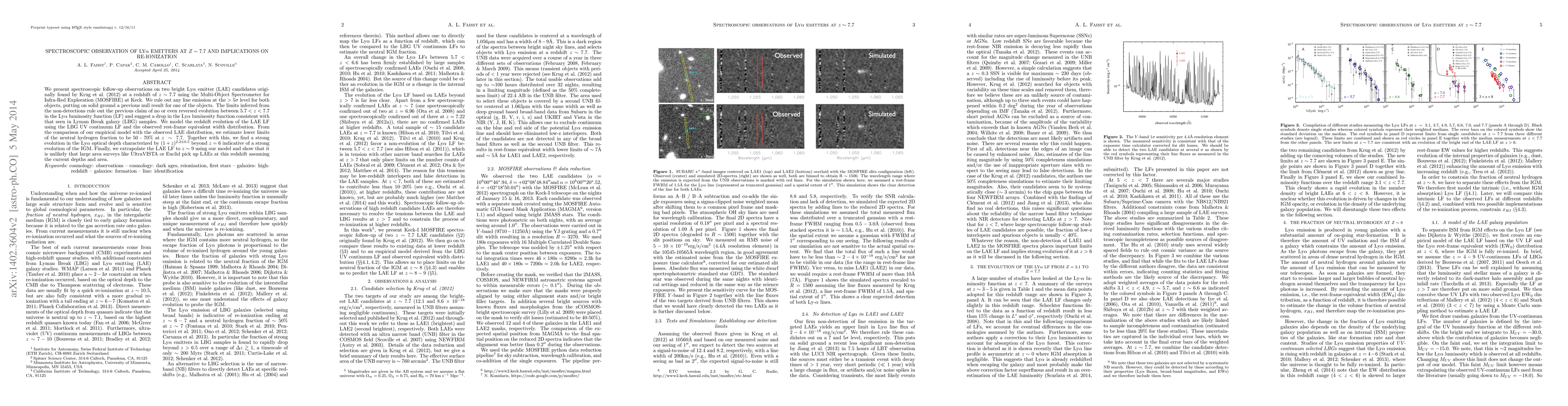 This paper reports spectroscopic observations of two Ly$\alpha$ emitter candidates at z~7.7, finding no line emission and suggesting a drop in the Ly$\alpha$ luminosity function consistent with Lyman Break galaxies, indicating a neutral hydrogen fraction of 50-70% at z~7.7 and a strong evolution of the intergalactic medium.