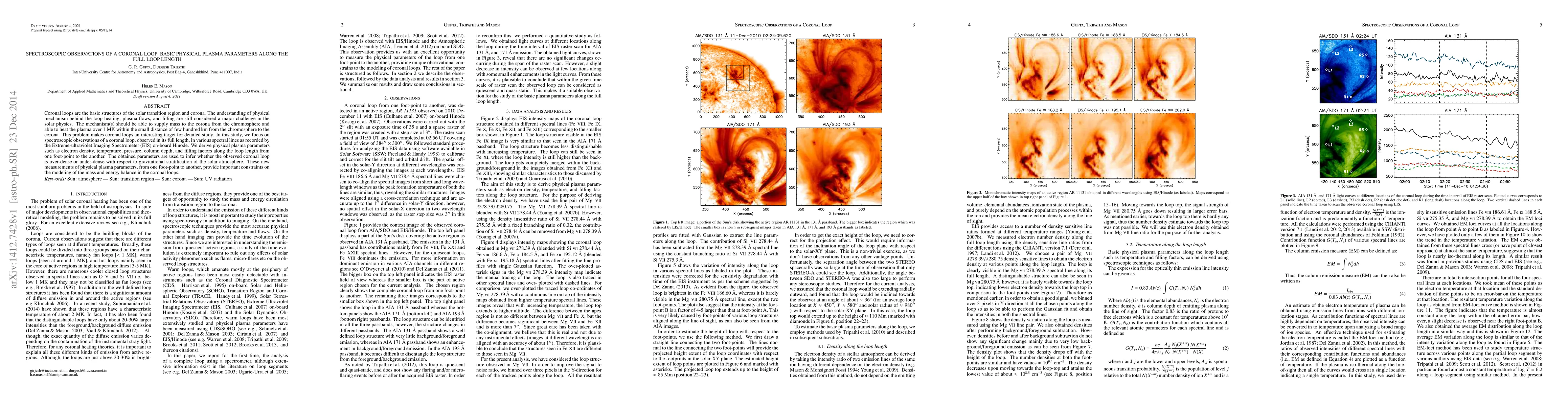 This study uses spectroscopic observations from the Hinode satellite's EIS to analyze a coronal loop's full length, deriving plasma parameters like electron density and temperature. The findings help understand the mass and energy balance in coronal loops, providing insights into their heating mechanisms.