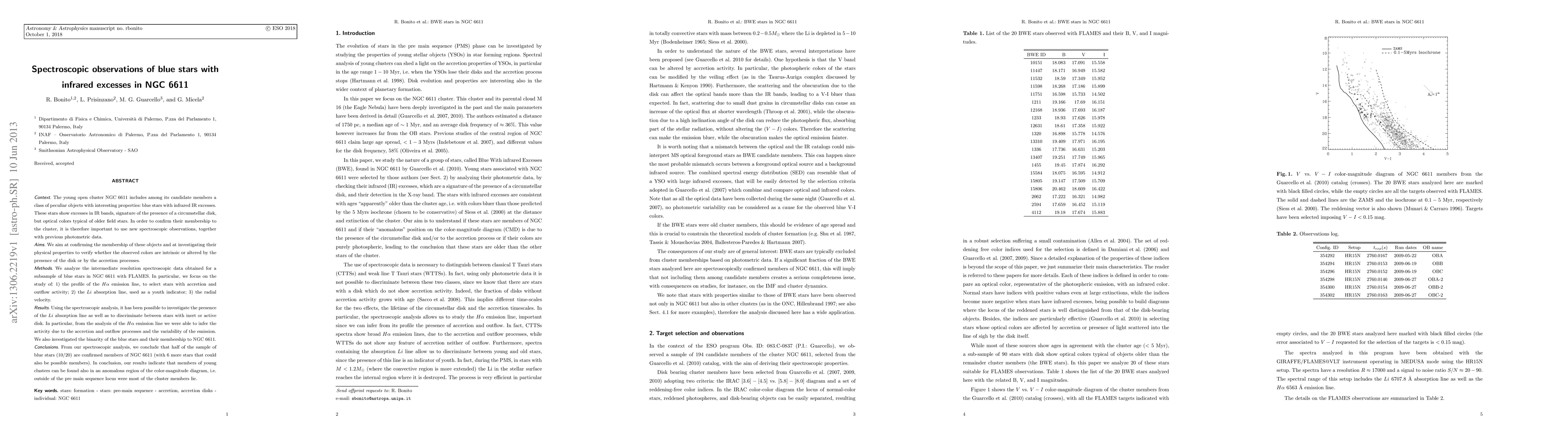 The young open cluster NGC 6611 includes among its candidate members a class of peculiar objects with interesting properties: blue stars with infrared IR excesses. These stars show excesses in IR bands, signature of the presence of a circumstellar disk, but optical colors typical of older field stars. In order to confirm their membership to the cluster, it is therefore important to use new spectroscopic observations, together with previous photometric data. We aim at confirming the membership of these objects and at investigating their physical properties to verify whether the observed colors are intrinsic or altered by the presence of the disk or by the accretion processes. We analyze the intermediate resolution spectroscopic data obtained for a subsample of blue stars in NGC 6611 with FLAMES. In particular, we focus on the study of: 1) the profile of the Ha emission line, to select stars with accretion and outflow activity; 2) the Li absorption line, used as a youth indicator; 3) the radial velocity. Using the spectroscopic analysis, it has been possible to investigate the presence of the Li absorption line as well as to discriminate between stars with inert or active disk. In particular, from the analysis of the Ha emission line we were able to infer the activity due to the accretion and outflow processes and the variability of the emission. We also investigated the binarity of the blue stars and their membership to NGC 6611.