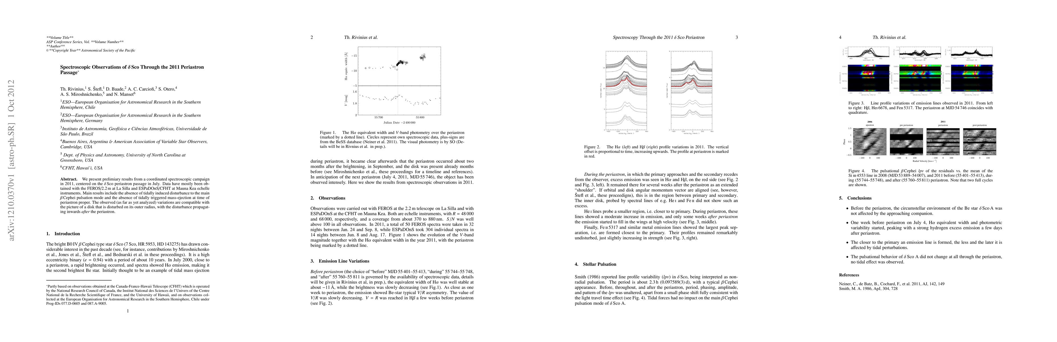 We present prelimiary results from a coordinated spectroscopic campaign in 2011, centered on the \delta Sco periastron passage in July. Data have mostly been obtained with the FEROS/2.2 m at La Silla and ESPaDOnS/CFHT at Mauna Kea echelle instruments. Main results include the absence of tidally induced disturbance to the main \beta Cephei pulsation mode and the absence of tidally triggered mass-ejection at time of periastron proper. The observed (as far as yet analyzed) variations are compatible with the picture of a disk that is disturbed on its outer radius, with the disturbance propagating inwards after the periastron.
