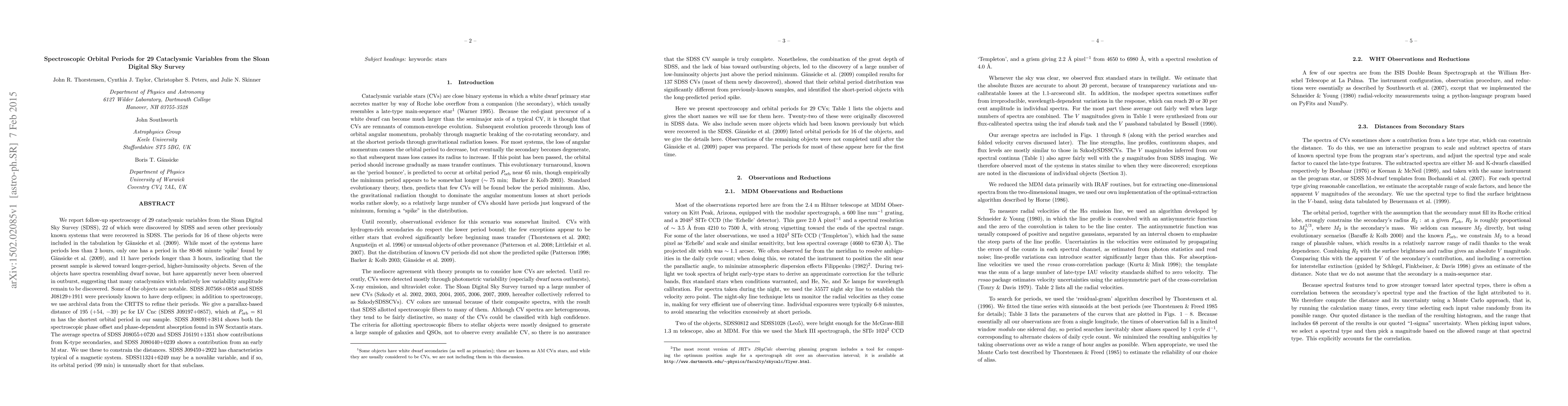 We report follow-up spectroscopy of 29 cataclysmic variables from the Sloan Digital Sky Survey (SDSS), 22 of which were discovered by SDSS and seven other previously known systems that were recovered in SDSS. The periods for 16 of these objects were included in the tabulation by Gaensicke et al. (2009). While most of the systems have periods less than 2 hours, only one has a period in the 80-86 minute 'spike' found by Gaensicke et al. (2009), and 11 have periods longer than 3 hours, indicating that the present sample is skewed toward longer-period, higher-luminosity objects. Seven of the objects have spectra resembling dwarf novae, but have apparently never been observed in outburst, suggesting that many cataclysmics with relatively low variability amplitude remain to be discovered. Some of the objects are notable. SDSS J07568+0858 and SDSS J08129+1911 were previously known to have deep eclipses; in addition to spectroscopy, we use archival data from the CRTTS to refine their periods. We give a parallax-based distance of 195 (+54, -39) pc for LV Cnc (SDSS J09197+0857), which at Porb = 81 m has the shortest orbital period in our sample. SDSS J08091+3814 shows both the spectroscopic phase offset and phase-dependent absorption found in SW Sextantis stars. The average spectra of SDSS J08055+0720 and SDSS J16191+1351 show contributions from K-type secondaries, and SDSS J080440+0239 shows a contribution from an early M star. We use these to constrain the distances. SDSS J09459+2922 has characteristics typical of a magnetic system. SDSS11324+6249 may be a novalike variable, and if so, its orbital period (99 min) is unusually short for that subclass.