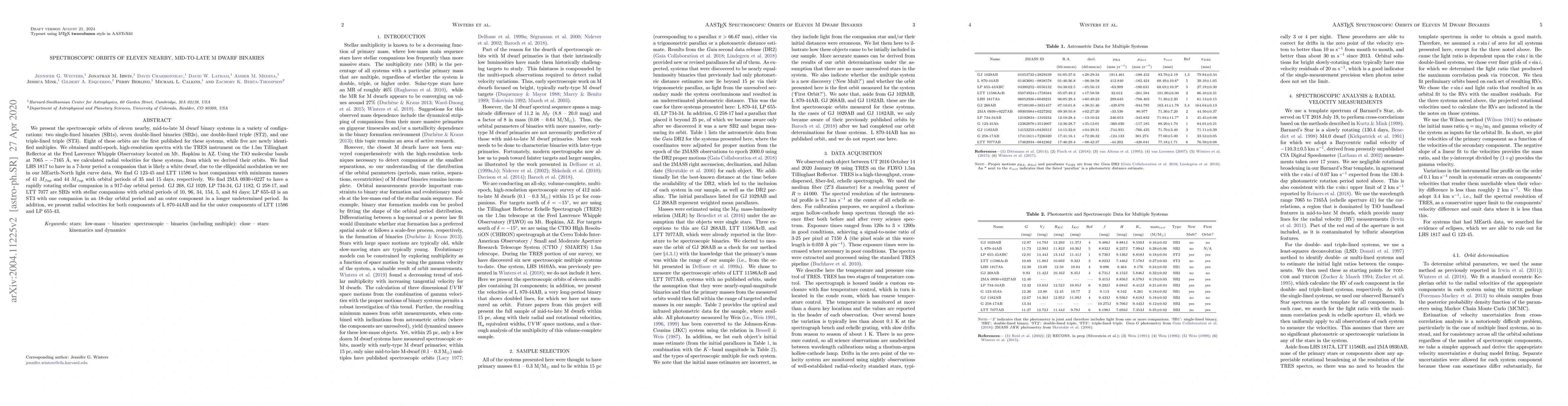 We present the spectroscopic orbits of eleven nearby, mid-to-late M dwarf binary systems in a variety of configurations: two single-lined binaries (SB1s), seven double-lined binaries (SB2s), one double-lined triple (ST2), and one triple-lined triple (ST3). Eight of these orbits are the first published for these systems, while five are newly identified multiples. We obtained multi-epoch, high-resolution spectra with the TRES instrument on the 1.5m Tillinghast Reflector at the Fred Lawrence Whipple Observatory located on Mt. Hopkins in AZ. Using the TiO molecular bands at 7065 -- 7165 Angstroms, we calculated radial velocities for these systems, from which we derived their orbits. We find LHS 1817 to have in a 7-hour period a companion that is likely a white dwarf, due to the ellipsoidal modulation we see in our MEarth-North light curve data. We find G 123-45 and LTT 11586 to host companions with minimum masses of 41 M_Jup and 44 M_Jup with orbital periods of 35 and 15 days, respectively. We find 2MA 0930+0227 to have a rapidly rotating stellar companion in a 917-day orbital period. GJ 268, GJ 1029, LP 734-34, GJ 1182, G 258-17, and LTT 7077 are SB2s with stellar companions with orbital periods of 10, 96, 34, 154, 5, and 84 days; LP 655-43 is an ST3 with one companion in an 18-day orbital period and an outer component in a longer undetermined period. In addition, we present radial velocities for both components of L 870-44AB and for the outer components of LTT 11586 and LP 655-43.