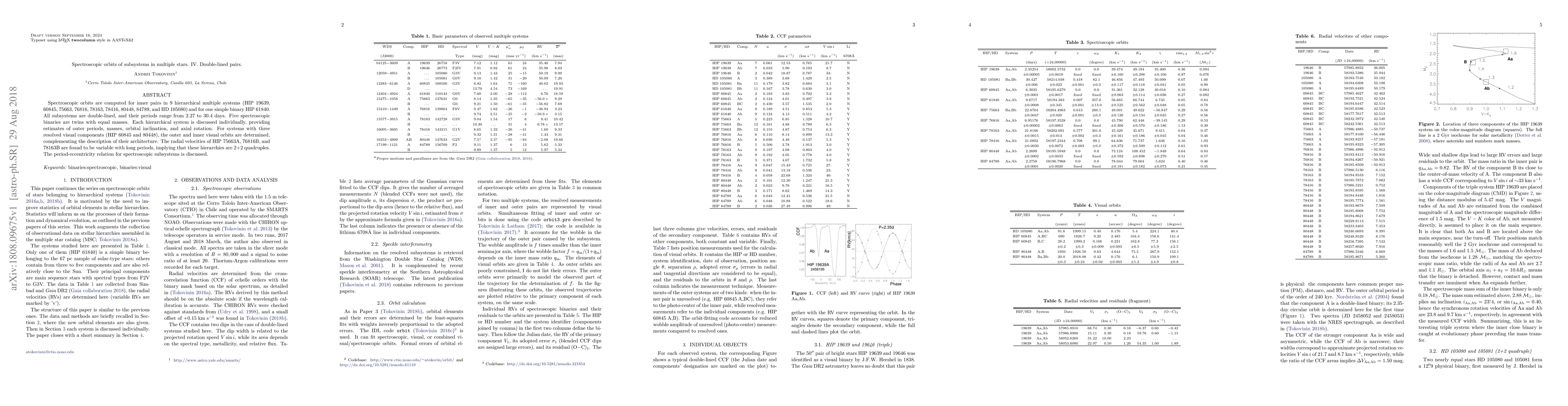 This paper computes spectroscopic orbits for inner pairs in nine hierarchical multiple star systems and one simple binary, detailing their periods, masses, and orbital characteristics. It finds that some systems exhibit long-period variations, suggesting complex quadruple structures, and discusses the period-eccentricity relation for these subsystems.