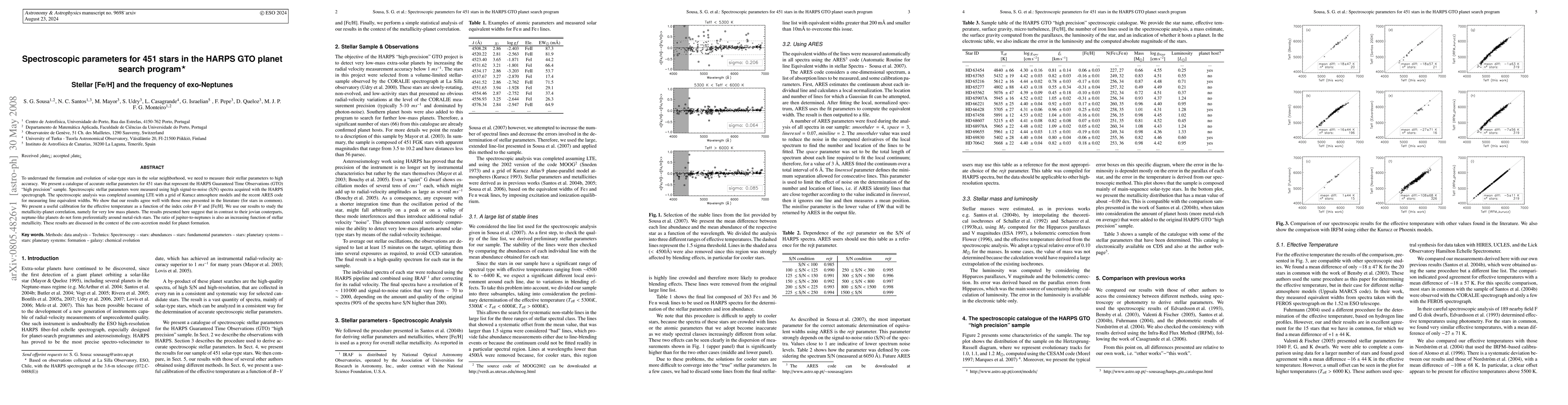 To understand the formation and evolution of solar-type stars in the solar neighborhood, we need to measure their stellar parameters to high accuracy. We present a catalogue of accurate stellar parameters for 451 stars that represent the HARPS Guaranteed Time Observations (GTO) ``high precision'' sample. Spectroscopic stellar parameters were measured using high signal-to-noise (S/N) spectra acquired with the HARPS spectrograph. The spectroscopic analysis was completed assuming LTE with a grid of Kurucz atmosphere models and the recent ARES code for measuring line equivalent widths. We show that our results agree well with those ones presented in the literature (for stars in common). We present a useful calibration for the effective temperature as a function of the index color B-V and [Fe/H]. We use our results to study the metallicity-planet correlation, namely for very low mass planets. The results presented here suggest that in contrast to their jovian couterparts, Neptune-like planets do not form preferentially around metal-rich stars. The ratio of jupiter-to-neptunes is also an increasing function of stellar metallicity. These results are discussed in the context of the core-accretion model for planet formation.