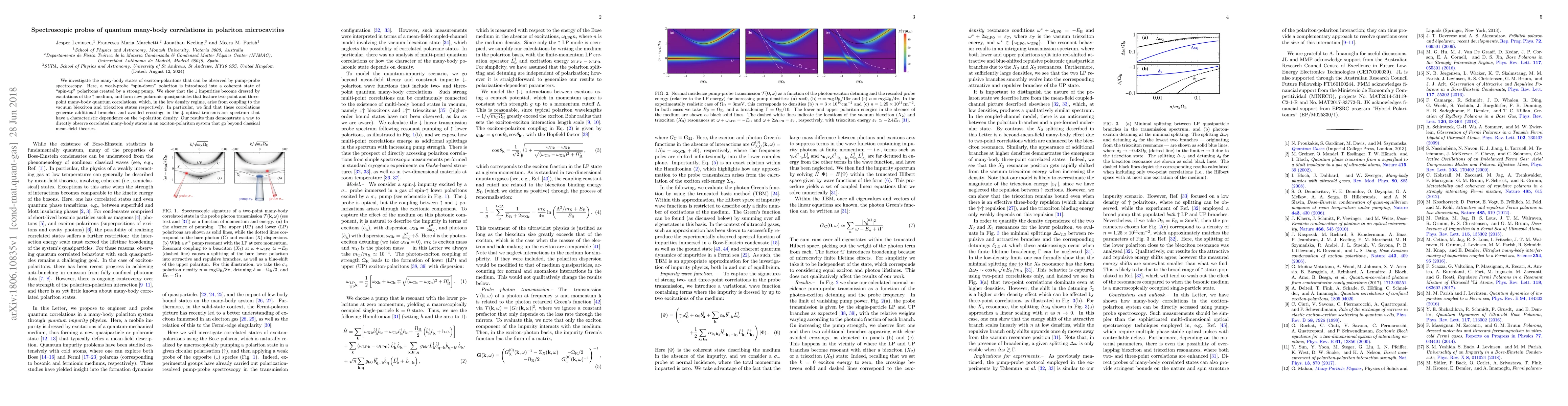 This paper investigates exciton-polariton many-body states using pump-probe spectroscopy, revealing new polaronic quasiparticles formed by $\downarrow$ impurities in a $\uparrow$ polariton medium. These quasiparticles exhibit two-point and three-point quantum correlations, observed through spectral features dependent on the $\uparrow$-polariton density, demonstrating beyond-classical mean-field interactions.