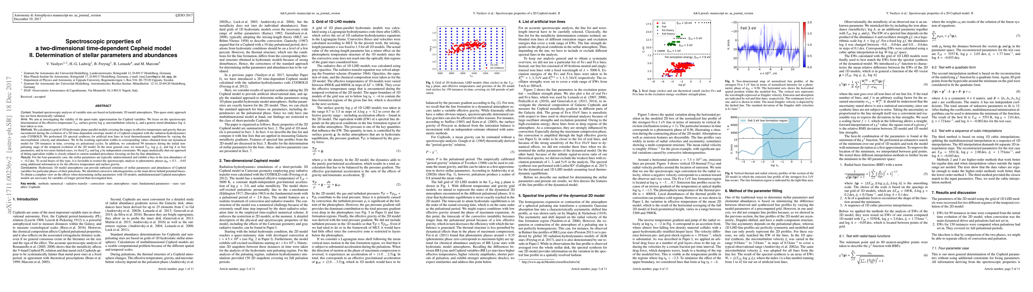 Standard spectroscopic analyses of variable stars are based on hydrostatic one-dimensional model atmospheres. This quasi-static approach has theoretically not been validated. We aim at investigating the validity of the quasi-static approximation for Cepheid variables. We focus on the spectroscopic determination of the effective temperature $T_\mathrm{eff}$, surface gravity $\log \,g$, microturbulent velocity $\xi_\mathrm{t}$, and a generic metal abundance $\log\,A$ -- here taken as iron. We calculate a grid of 1D hydrostatic plane-parallel models covering the ranges in effective temperature and gravity encountered during the evolution of a two-dimensional time-dependent envelope model of a Cepheid computed with the radiation-hydrodynamics code CO5BOLD. We perform 1D spectral syntheses for artificial iron lines in local thermodynamic equilibrium varying the microturbulent velocity and abundance. We fit the resulting equivalent widths to corresponding values obtained from our dynamical model. For the four-parametric case, the stellar parameters are typically underestimated exhibiting a bias in the iron abundance of $\approx-0.2\,\mbox{dex}$. To avoid biases of this kind it is favourable to restrict the spectroscopic analysis to photometric phases $\phi_\mathrm{ph}\approx0.3\ldots 0.65$ using additional information to fix effective temperature and surface gravity. Hydrostatic 1D model atmospheres can provide unbiased estimates of stellar parameters and abundances of Cepheid variables for particular phases of their pulsations. We identified convective inhomogeneities as the main driver behind potential biases. For obtaining a complete view on the effects when determining stellar parameters with 1D models, multi-dimensional Cepheid atmosphere models are necessary for variables of longer period than investigated here.