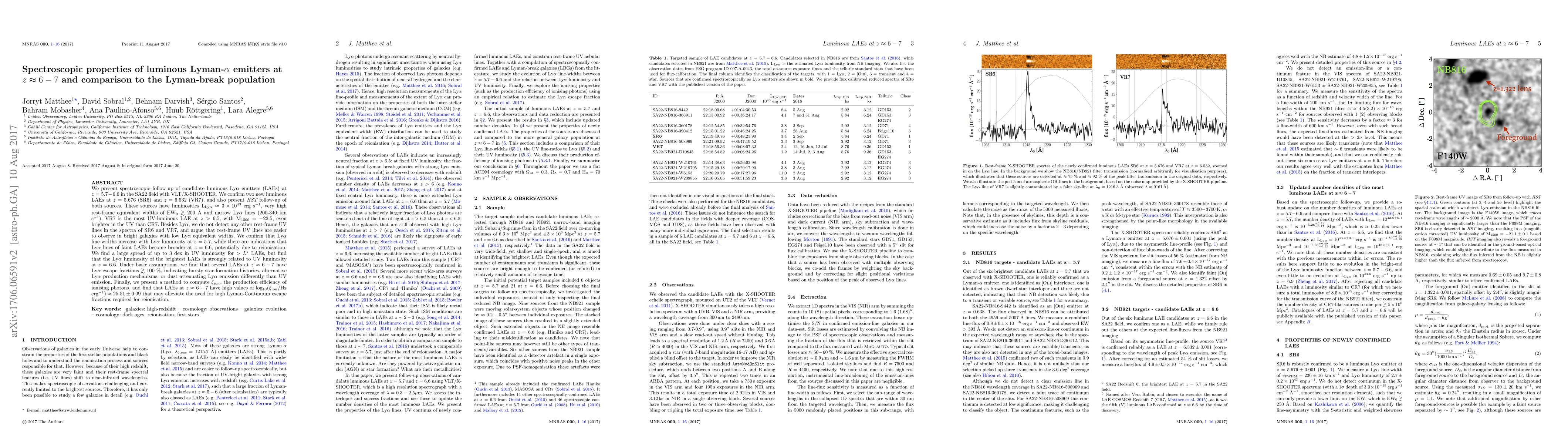 We present spectroscopic follow-up of candidate luminous Ly$\alpha$ emitters (LAEs) at $z=5.7-6.6$ in the SA22 field with VLT/X-SHOOTER. We confirm two new luminous LAEs at $z=5.676$ (SR6) and $z=6.532$ (VR7), and also present {\it HST} follow-up of both sources. These sources have luminosities L$_{\rm Ly\alpha} \approx 3\times10^{43}$ erg s$^{-1}$, very high rest-frame equivalent widths of EW$_0\gtrsim 200$ {\AA} and narrow Ly$\alpha$ lines (200-340 km s$^{-1}$). VR7 is the most UV-luminous LAE at $z>6.5$, with M$_{1500} = -22.5$, even brighter in the UV than CR7. Besides Ly$\alpha$, we do not detect any other rest-frame UV lines in the spectra of SR6 and VR7, and argue that rest-frame UV lines are easier to observe in bright galaxies with low Ly$\alpha$ equivalent widths. We confirm that Ly$\alpha$ line-widths increase with Ly$\alpha$ luminosity at $z=5.7$, while there are indications that Ly$\alpha$ lines of faint LAEs become broader at $z=6.6$, potentially due to reionisation. We find a large spread of up to 3 dex in UV luminosity for $>L^{\star}$ LAEs, but find that the Ly$\alpha$ luminosity of the brightest LAEs is strongly related to UV luminosity at $z=6.6$. Under basic assumptions, we find that several LAEs at $z\approx6-7$ have Ly$\alpha$ escape fractions $\gtrsim100$ \%, indicating bursty star-formation histories, alternative Ly$\alpha$ production mechanisms, or dust attenuating Ly$\alpha$ emission differently than UV emission. Finally, we present a method to compute $\xi_{ion}$, the production efficiency of ionising photons, and find that LAEs at $z\approx6-7$ have high values of log$_{10}(\xi_{ion}$/Hz erg$^{-1}) \approx 25.51\pm0.09$ that may alleviate the need for high Lyman-Continuum escape fractions required for reionisation.