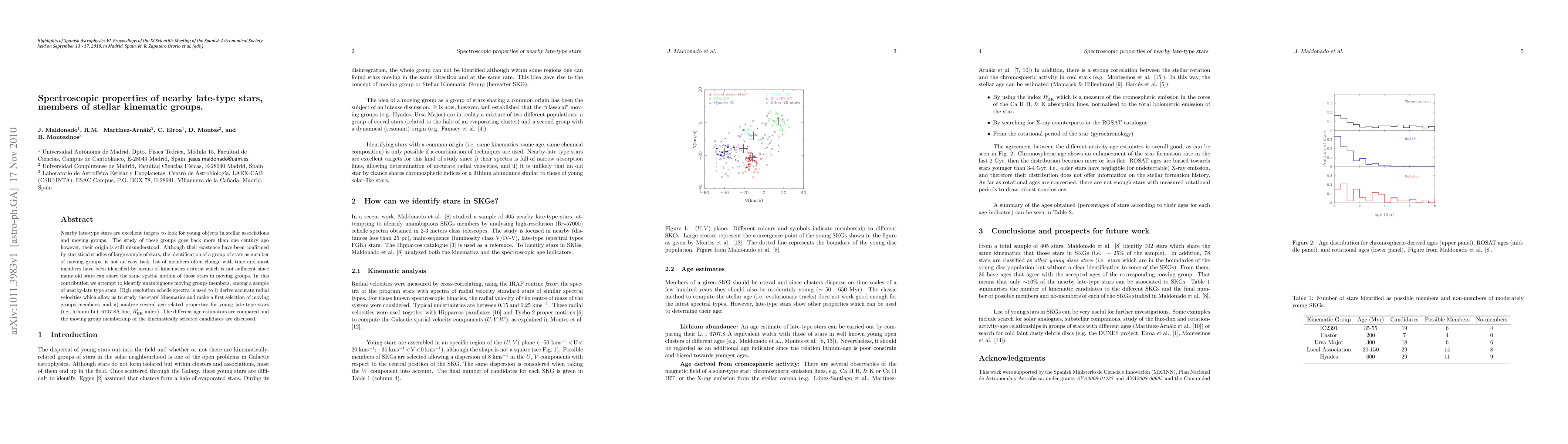 Nearby late-type stars are excellent targets to look for young objects in stellar associations and moving groups. The study of these groups goes back more than one century ago however, their origin is still misunderstood. Although their existence have been confirmed by statistical studies of large sample of stars, the identification of a group of stars as member of moving groups, is not an easy task, list of members often change with time and most members have been identified by means of kinematics criteria which is not sufficient since many old stars can share the same spatial motion of those stars in moving groups. In this contribution we attempt to identify unambiguous moving groups members, among a sample of nearby-late type stars. High resolution echelle spectra is used to i) derive accurate radial velocities which allow us to study the stars' kinematics and make a first selection of moving groups members; and ii) analyze several age-related properties for young late-type stars (i.e., lithium LiI 6707.8 Amstrongs, R'HK index). The different age-estimators are compared and the moving group membership of the kinematically selected candidates are discussed.