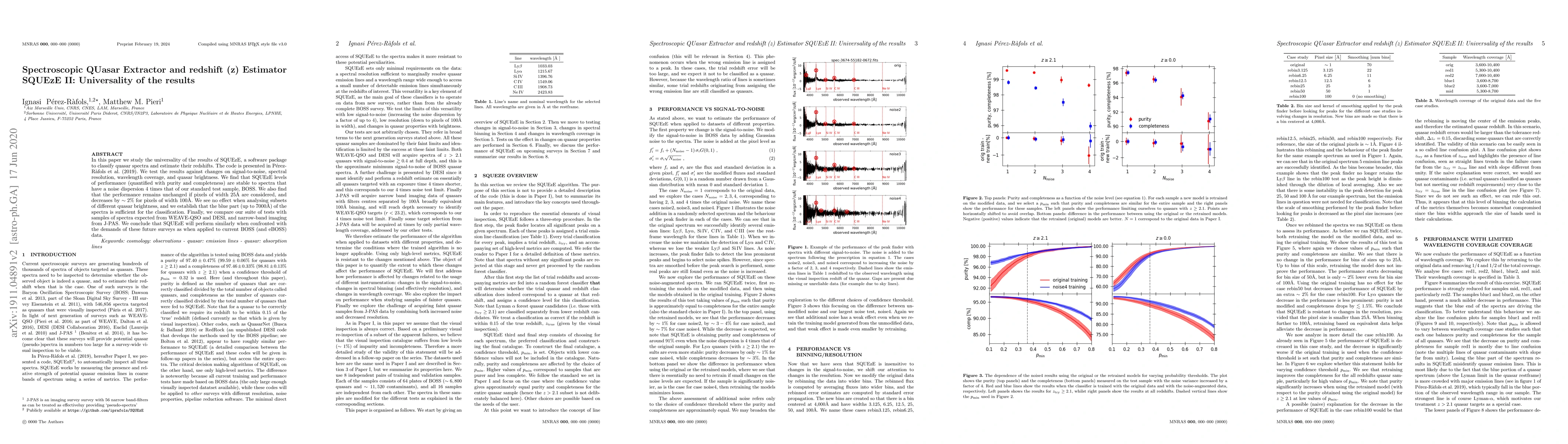 In this paper we study the universality of the results of SQUEzE, a software package to classify quasar spectra and estimate their redshifts. The code is presented in \cite{Perez-Rafols+2019}. We test the results against changes on signal-to-noise, spectral resolution, wavelength coverage, and quasar brightness. We find that SQUEzE levels of performance (quantified with purity and completeness) are stable to spectra that have a noise dispersion 4 times that of our standard test sample, BOSS. We also find that the performance remains unchanged if pixels of width 25\AA are considered, and decreases by $\sim2\%$ for pixels of width 100\AA. We see no effect when analyzing subsets of different quasar brightness, and we establish that the blue part (up to 7000\AA) of the spectra is sufficient for the classification. Finally, we compare our suite of tests with samples of spectra expected from WEAVE-QSO and DESI, and narrow-band imaging from J-PAS. We conclude that SQUEzE will perform similarly when confronted with the demands of these future surveys as when applied to current BOSS (and eBOSS) data. {\it Keywords: cosmology: observations - quasar: emission lines - quasar: absorption lines}