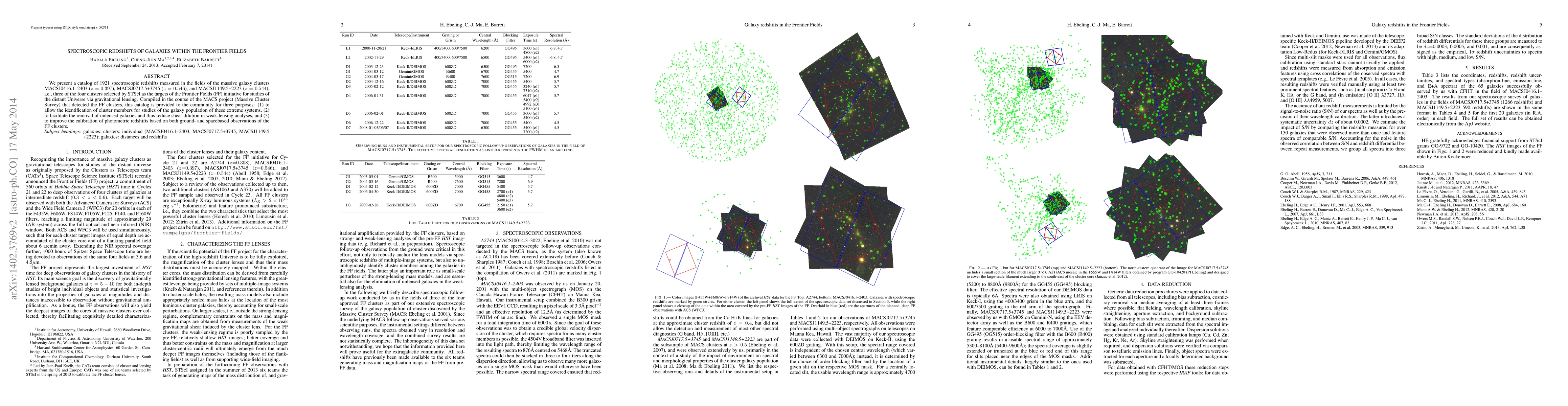 We present a catalog of 1921 spectroscopic redshifts measured in the fields of the massive galaxy clusters MACSJ0416.1--2403 ($z=0.397$), MACSJ0717.5+3745 ($z=0.546$), and MACSJ1149.5+2223 ($z=0.544$), i.e., three of the four clusters selected by STScI as the targets of the Frontier Fields (FF) initiative for studies of the distant Universe via gravitational lensing. Compiled in the course of the MACS project (Massive Cluster Survey) that detected the FF clusters, this catalog is provided to the community for three purposes: (1) to allow the identification of cluster members for studies of the galaxy population of these extreme systems, (2) to facilitate the removal of unlensed galaxies and thus reduce shear dilution in weak-lensing analyses, and (3) to improve the calibration of photometric redshifts based on both ground- and spacebased observations of the FF clusters.