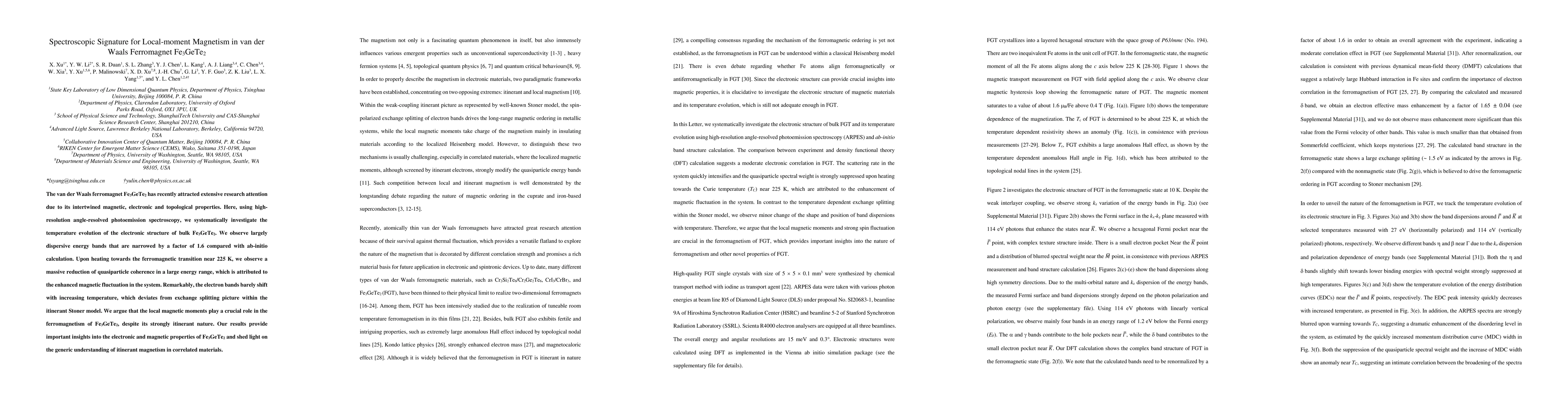 This study uses high-resolution spectroscopy to examine the electronic structure of Fe$_3$GeTe$_2$, revealing significant magnetic fluctuation and reduced quasiparticle coherence near its ferromagnetic transition. The findings highlight the role of local magnetic moments in its ferromagnetism, despite its itinerant electronic nature.