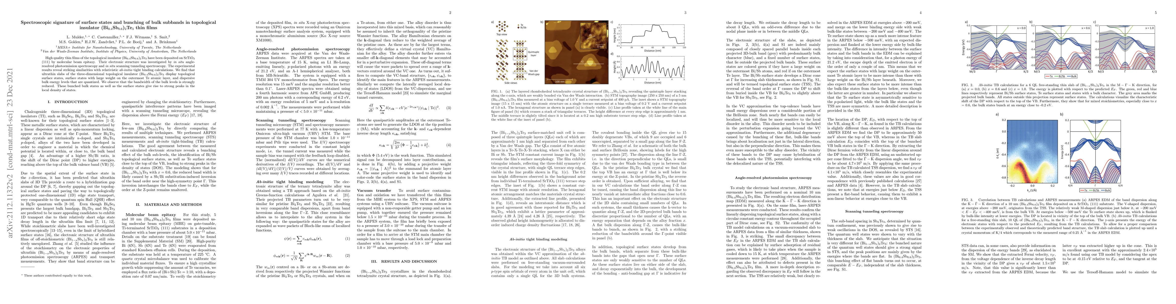 This paper investigates high-quality thin films of topological insulator (Bi$_{0.4}$Sb$_{0.6}$)$_2$Te$_3$ using in situ spectroscopic techniques, revealing topological surface states and quantized, bunched bulk subbands with reduced bandwidth, giving rise to distinct peaks in the local density of states.