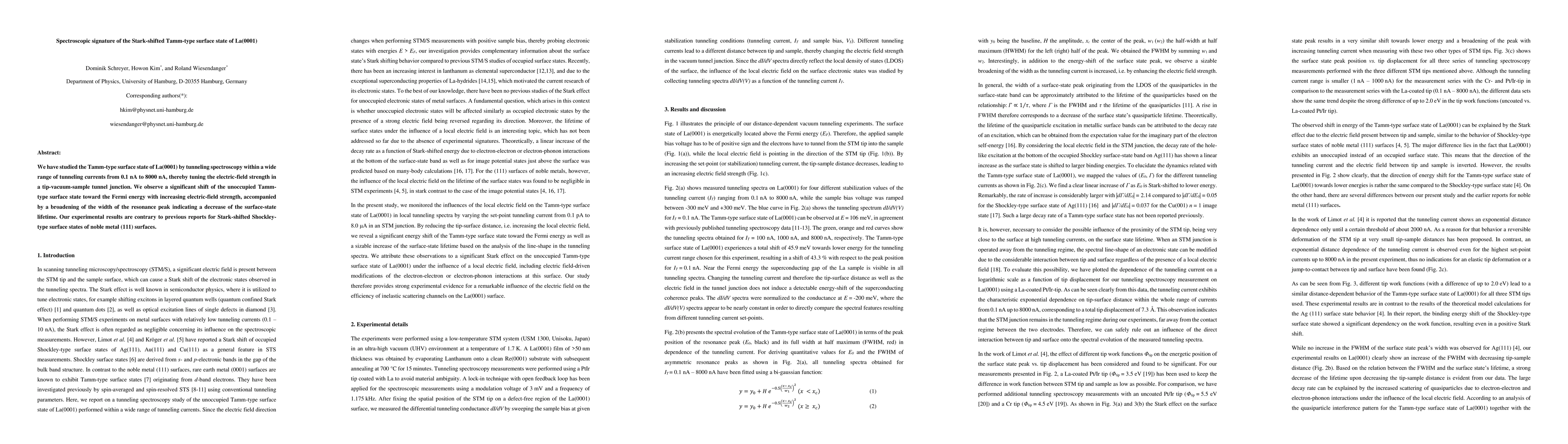 The research investigates the Tamm-type surface state of La(0001) using tunneling spectroscopy over a wide current range. Key findings reveal a shift of the unoccupied Tamm state towards the Fermi energy with increased electric-field strength, along with peak broadening indicating reduced surface-state lifetime. These results contrast previous studies on Stark-shifted Shockley-type surface states of noble metal (111) surfaces.