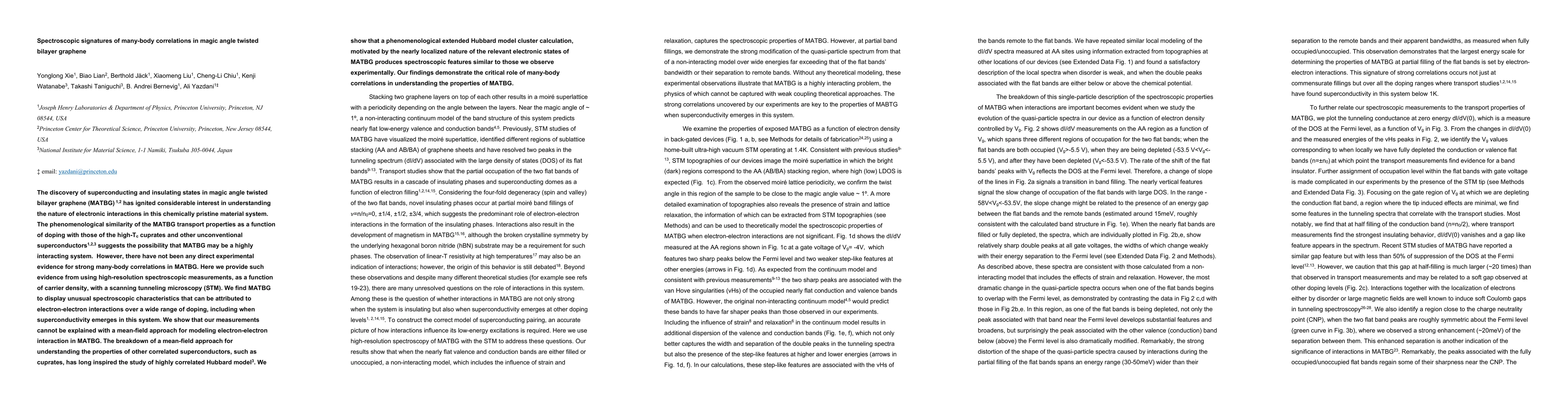This paper uses high-resolution spectroscopic measurements to provide direct evidence of strong many-body correlations in magic angle twisted bilayer graphene (MATBG), showing that its properties cannot be explained by mean-field theories and suggesting a role for electron-electron interactions akin to those in high-Tc cuprates.