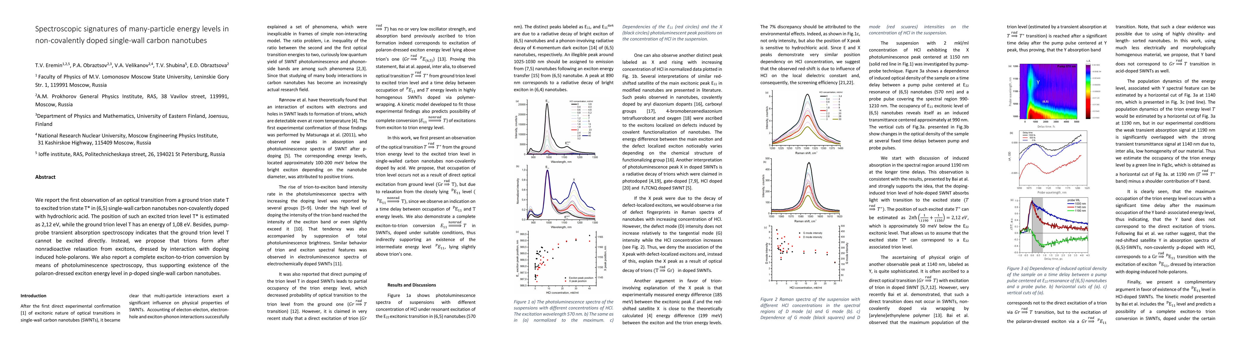 This paper reports the first observation of optical transitions between ground and excited trion states in (6,5) single-wall carbon nanotubes doped with hydrochloric acid, revealing an excited trion level at 2.12 eV and a ground trion level at 1.08 eV. It proposes that trions form through nonradioactive relaxation from excitons interacting with doping-induced hole-polarons, supported by complete exciton-to-trion conversion via photoluminescence spectroscopy.