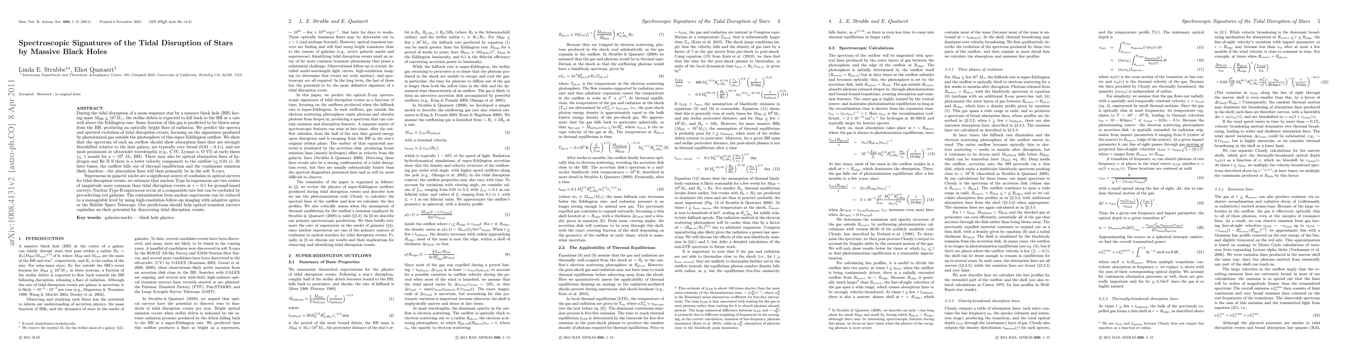 During the tidal disruption of a star by a massive black hole (BH) of mass MBH <~ 10^7 Msun, stellar debris falls back to the BH at a rate well above the Eddington rate. A fraction of this gas is subsequently blown away from the BH, producing an optically bright flare of radiation. We predict the spectra and spectral evolution of tidal disruption events, focusing on the photoionized gas outside this outflow's photosphere. The spectrum will show absorption lines that are strongly blueshifted relative to the host galaxy, very broad (0.01-0.1c), and strongest at UV wavelengths (e.g., C IV, Ly alpha, O VI), lasting ~ 1 month for a 10^6 Msun BH. Meanwhile, supernovae in galactic nuclei are a significant source of confusion in optical surveys for tidal disruption events: we estimate that nuclear Type Ia supernovae are two orders of magnitude more common than tidal disruption events at z ~ 0.1 for ground-based surveys. Nuclear Type II supernovae occur at a comparable rate but can be excluded by pre-selecting red galaxies. Supernova contamination can be reduced to a manageable level using high-resolution follow-up imaging with adaptive optics or the Hubble Space Telescope. Our predictions should help optical transient surveys capitalize on their potential for discovering tidal disruption events.
