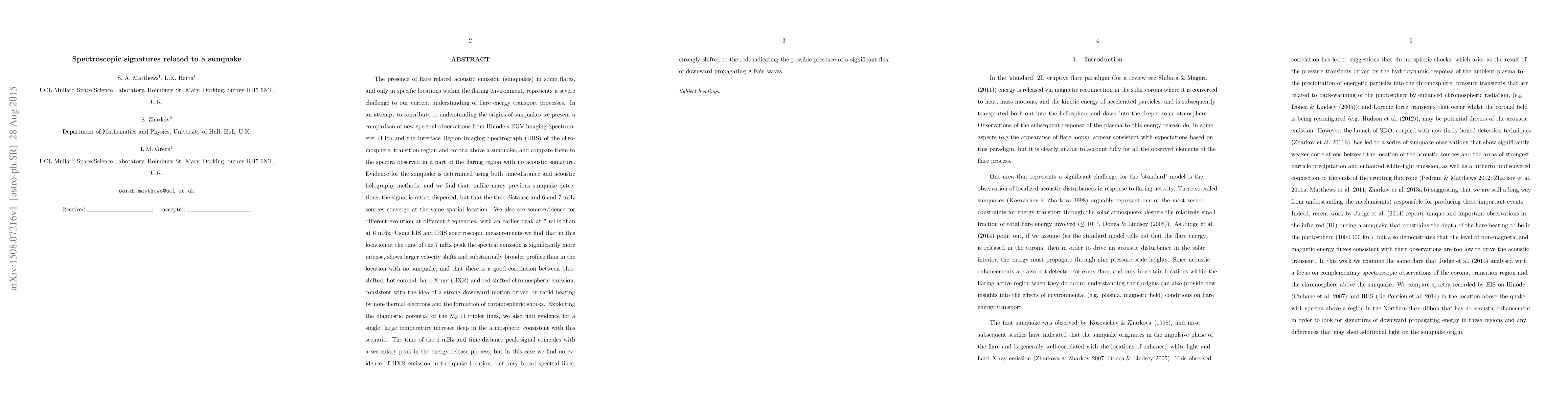 The presence of flare related acoustic emission (sunquakes) in some flares represents a severe challenge to our current understanding of flare energy transport processes. We present a comparison of new spectral observations from Hinode's EUV imaging Spectrometer (EIS) and the Interface Region Imaging Spectrograph (IRIS) of the atmosphere above a sunquake, and compare them to the spectra observed in a part of the flaring region with no acoustic signature. Evidence for the sunquake is determined using both time-distance and acoustic holography methods, and we find that, unlike many previous sunquake detections, the signal is rather dispersed, but that the time-distance and 6 and 7 mHz sources converge at the same spatial location. We also see some evidence for different evolution at different frequencies, with an earlier peak at 7 mHz than at 6 mHz. Using spectroscopic measurements we find that in this location at the time of the 7 mHz peak the spectral emission is significantly more intense, shows larger velocity shifts and substantially broader profiles than in the location with no sunquake, and that there is a good correlation between blue-shifted, hot coronal, hard X-ray (HXR) and red-shifted chromospheric emission, consistent with the idea of a strong downward motion driven by rapid heating by non-thermal electrons and the formation of chromospheric shocks. Exploiting the diagnostic potential of the Mg II triplet lines, we also find evidence for a single, large temperature increase deep in the atmosphere, consistent with this scenario. The time of the 6 mHz and time-distance peak signal coincides with a secondary peak in the energy release process, but in this case we find no evidence of HXR emission in the quake location, but very broad spectral lines, strongly shifted to the red, indicating the possible presence of a significant flux of downward propagating Alfven waves.