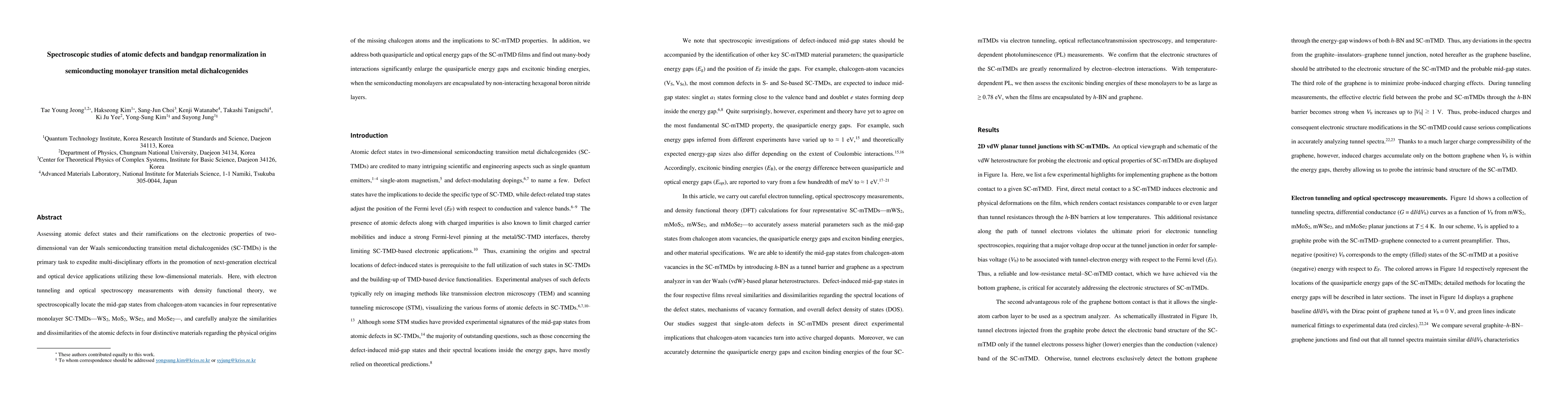 This paper investigates atomic defects in semiconducting monolayer transition metal dichalcogenides (SC TMDs) using electron tunneling and optical spectroscopy, identifying midgap states from chalcogen vacancies. It finds that many-body interactions notably enhance quasiparticle energy gaps and excitonic binding energies when encapsulated by hexagonal boron nitride layers.