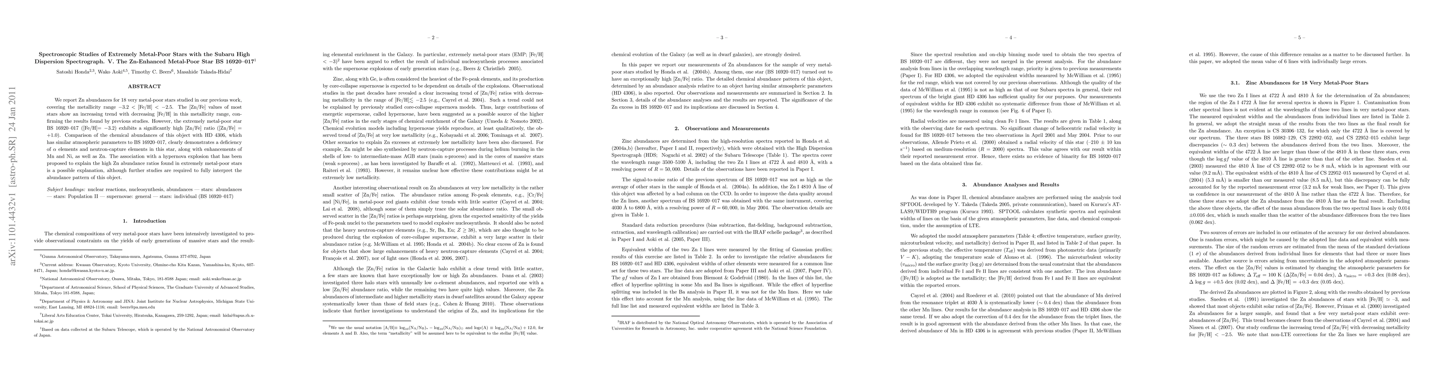 This study reports Zn abundances for 18 extremely metal-poor stars, finding a high [Zn/Fe] ratio in BS 16920-017, which also shows deficiencies in alpha and neutron-capture elements, suggesting a hypernova explosion as a potential explanation. Further research is needed to fully understand this unique abundance pattern.