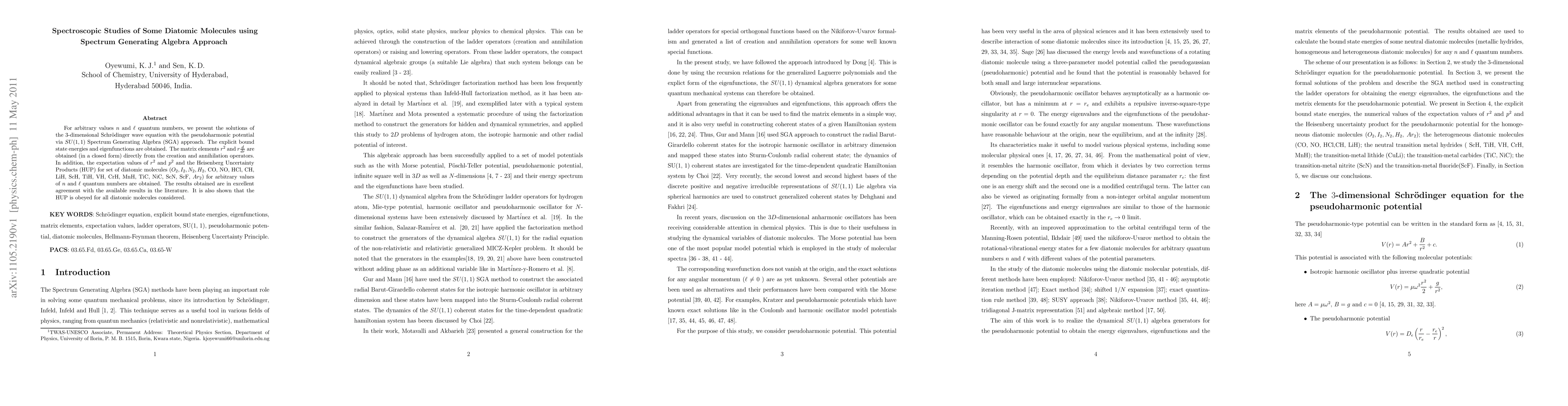 This paper uses the SU(1,1) Spectrum Generating Algebra approach to solve the 3-dimensional Schrödinger wave equation for diatomic molecules under a pseudoharmonic potential, yielding explicit bound state energies and eigenfunctions. The study also computes matrix elements and expectation values, confirming adherence to the Heisenberg Uncertainty Principle.