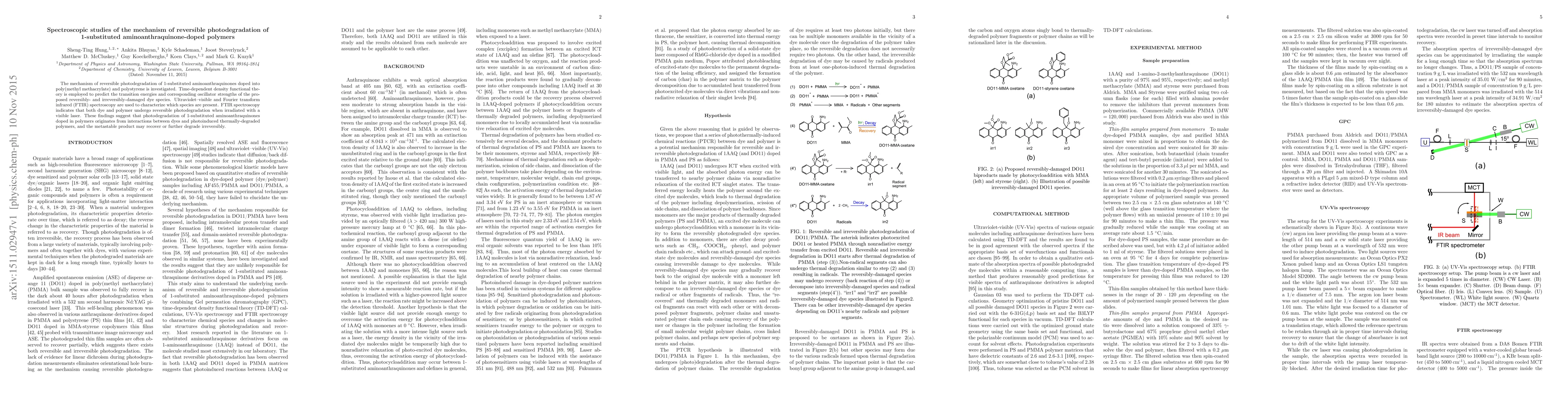 This study investigates the reversible photodegradation mechanism of 1-substituted aminoanthraquinones in poly(methyl methacrylate) and polystyrene using spectroscopic methods and time-dependent density functional theory. Findings suggest that interactions between dyes and thermally-degraded polymers lead to reversible or irreversible degradation.