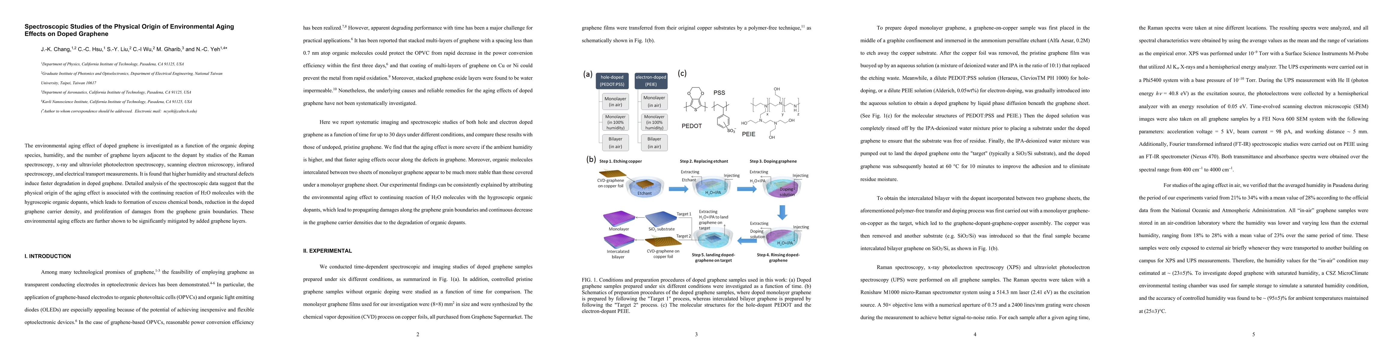 The environmental aging effect of doped graphene is investigated as a function of the organic doping species, humidity, and the number of graphene layers adjacent to the dopant by studies of the Raman spectroscopy, x-ray and ultraviolet photoelectron spectroscopy, scanning electron microscopy, infrared spectroscopy, and electrical transport measurements. It is found that higher humidity and structural defects induce faster degradation in doped graphene. Detailed analysis of the spectroscopic data suggest that the physical origin of the aging effect is associated with the continuing reaction of H2O molecules with the hygroscopic organic dopants, which leads to formation of excess chemical bonds, reduction in the doped graphene carrier density, and proliferation of damages from the graphene grain boundaries. These environmental aging effects are further shown to be significantly mitigated by added graphene layers.