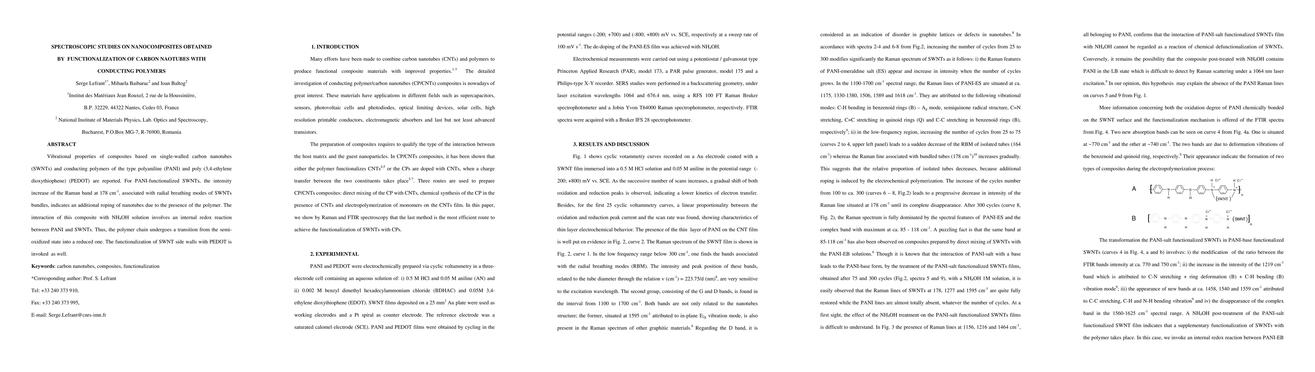 This study investigates the vibrational properties of nanocomposites formed by functionalizing single-walled carbon nanotubes (SWNTs) with conducting polymers like polyaniline (PANI) and poly(3,4-ethylene dioxythiophene) (PEDOT). The Raman spectroscopy reveals enhanced interaction between PANI and SWNTs, indicating a redox reaction in the composite with NH4OH solution.