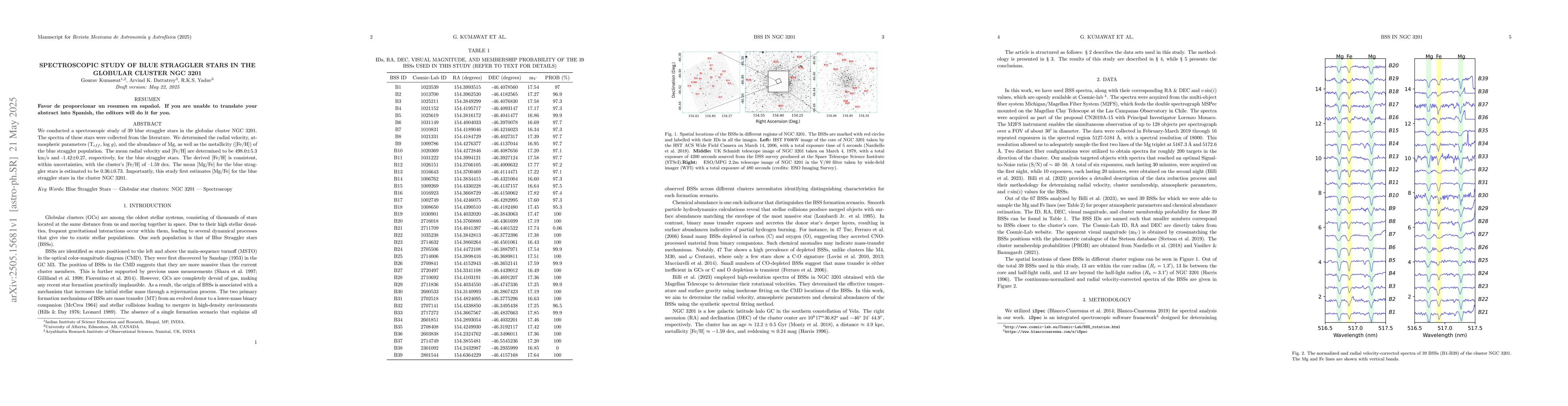 Researchers studied 39 blue straggler stars in NGC 3201 globular cluster, finding a mean radial velocity of 498 km/s and metallicity of -1.42 dex, consistent with the cluster's overall properties.