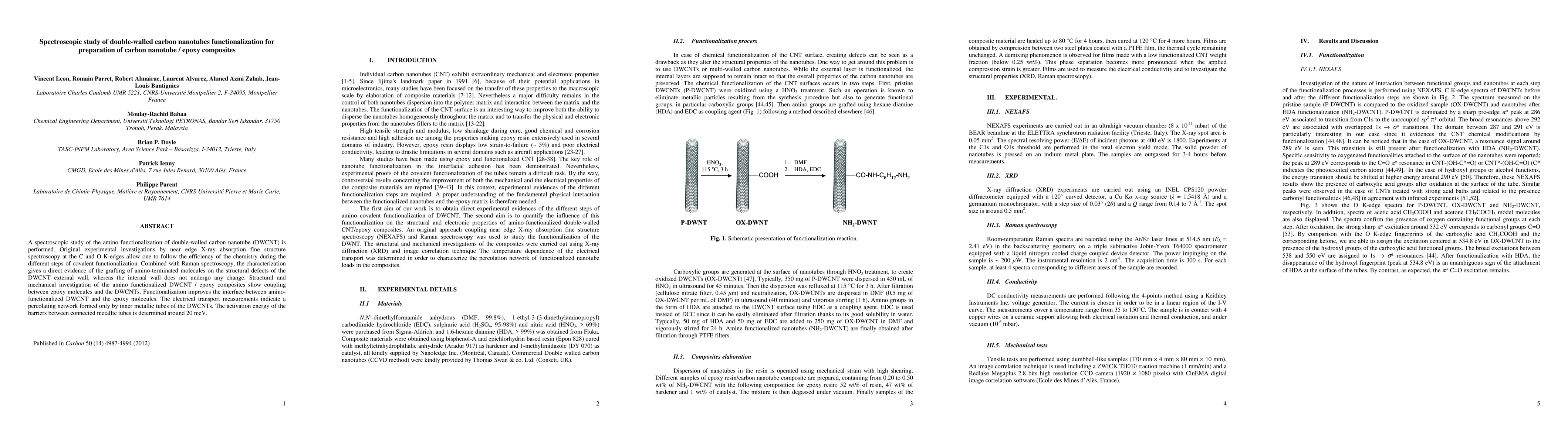 Summary: This study employs spectroscopic techniques to investigate the amino functionalization of double-walled carbon nanotubes, showing successful grafting on the external wall but not the internal. Functionalized DWCNTs in epoxy composites exhibit improved mechanical coupling and electrical percolation networks, with activation energy of 20 meV for metallic tube connections.