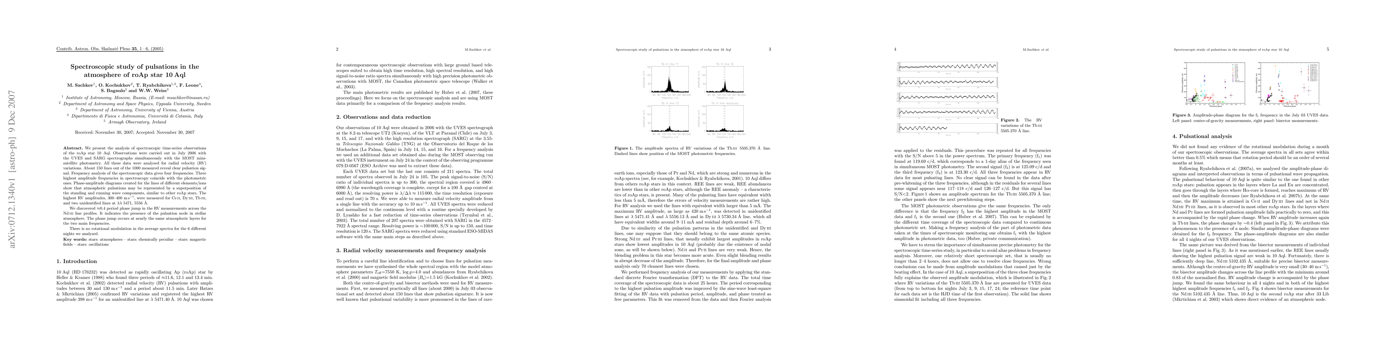 This study analyzes spectroscopic time-series observations of the roAp star 10 Aql, revealing 150 lines with clear pulsation signals and identifying four frequencies, three of which coincide with photometric data. The analysis indicates atmospheric pulsations represented by standing and running wave components, with significant radial velocity amplitudes for certain lines.