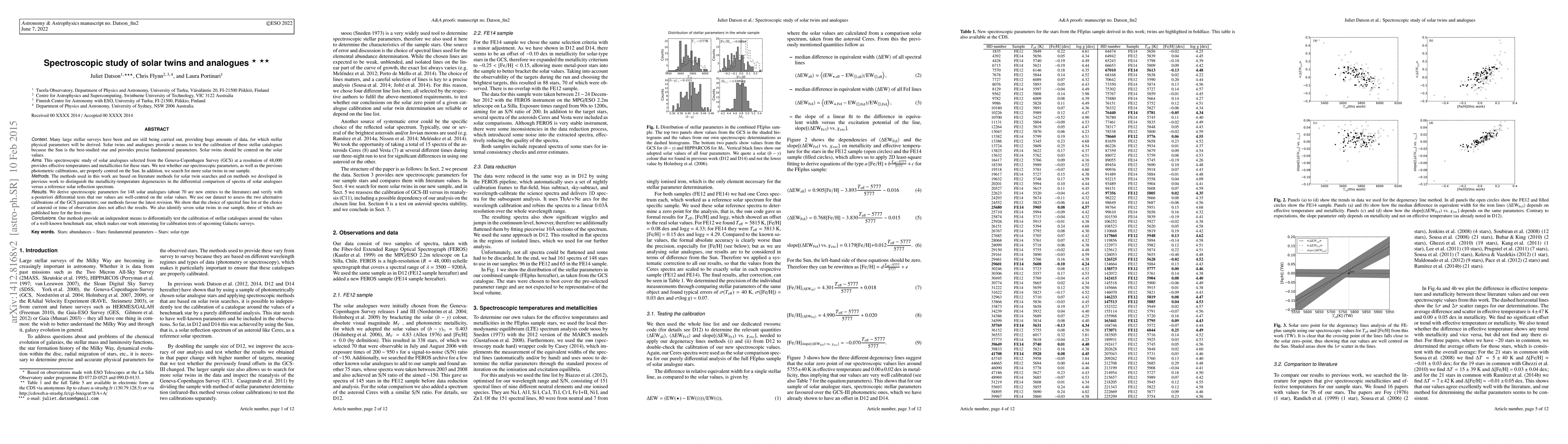 This spectroscopic study of solar analogues from the Geneva-Copenhagen Survey provides effective temperatures and metallicities for 148 stars, verifying that these parameters are well-centered on solar values. The research identifies seven solar twins, including three new discoveries, and supports the latest calibration of GCS parameters.