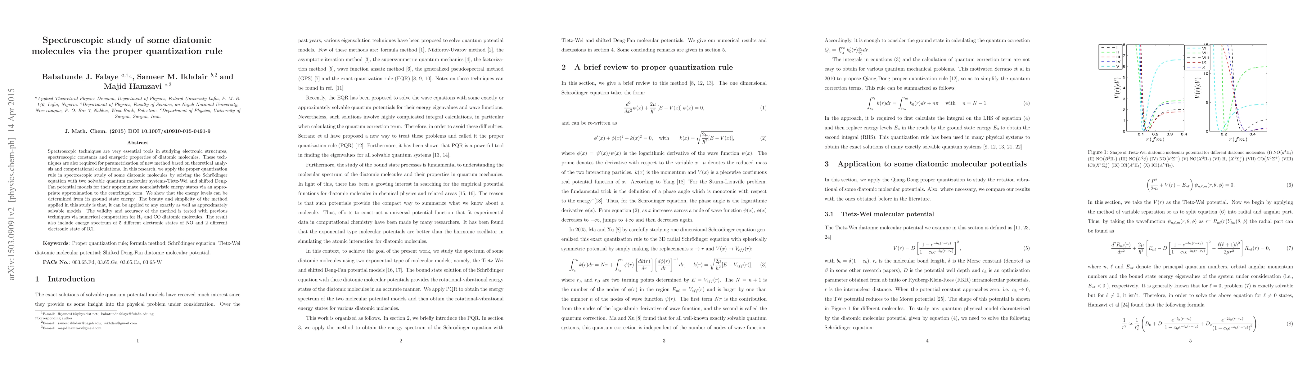 This research applies the proper quantization rule to spectroscopically study diatomic molecules using the Tietze-Wei and shifted Deng-Fan potential models, demonstrating accurate determination of energy levels for H$_2$, CO, NO, and ICl. The method's validity and simplicity are shown through comparison with previous techniques.