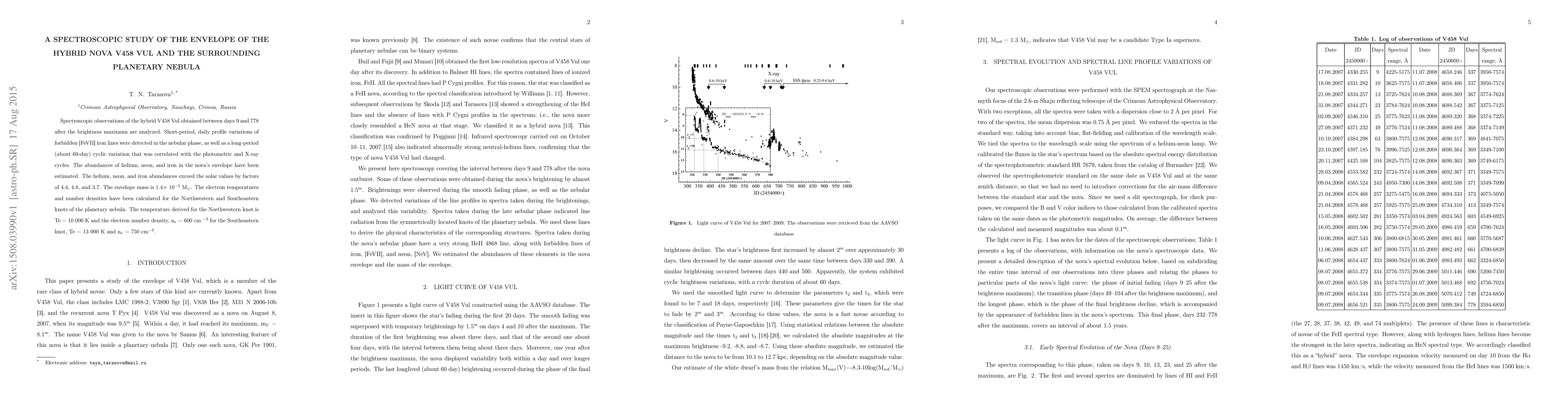 Spectroscopic observations of the hybrid V458 Vul obtained between days 9 and 778 after the brightness maximum are analyzed. Short-period, daily profile variations of forbidden [FeVII] iron lines were detected in the nebular phase, as well as a long-period (about 60-day) cyclic variation that was correlated with the photometric and X-ray cycles. The abundances of helium, neon, and iron in the nova's envelope have been estimated. The helium, neon, and iron abundances exceed the solar values by factors of 4.4, 4.8, and 3.7. The envelope mass is 1.4$\times$ 10$^{-5}$M$_{\odot}$. The electron temperatures and number densities have been calculated for the Northwestern and Southeastern knots of the planetary nebula. The temperature derived for the Northwestern knot is Te = 10 000 K and the electron number density, n$_{e}$ = 600 cm $^{-3}$ for the Southeastern knot, Te = 13 000 K and n$_{e}$ = 750 cm$^{-3}$.