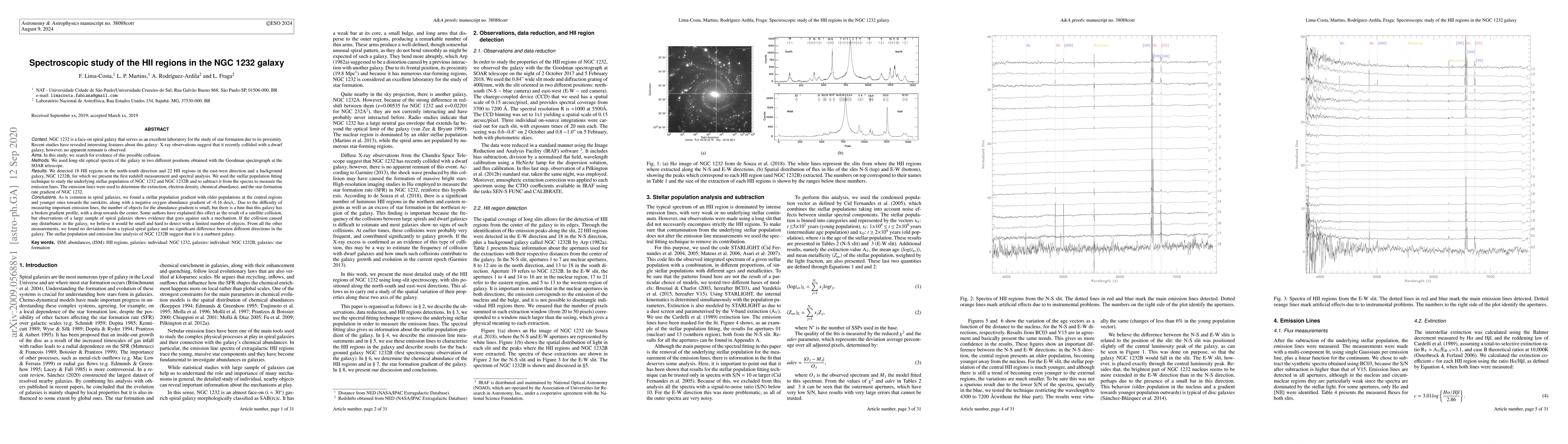 NGC 1232 is a face-on spiral galaxy that serves as an excellent laboratory for the study of star formation due to its proximity. Recent studies have revealed interesting features about this galaxy: X-ray observations suggest that it recently collided with a dwarf galaxy, however, no apparent remnant is observed. Here we search for evidence of this collision. We used long-slit optical spectra in two different positions obtained with the Goodman spectrograph at the SOAR telescope. We detected 18 HII regions in the north-south direction and 22 HII regions in the east-west direction and a background galaxy, NGC 1232B, for which we present the first redshift measurement and spectral analysis. We used the stellar population fitting technique to study the underlying stellar population and to subtract it from the spectra to measure the emission lines. The emission lines were used to determine the extinction, electron density, chemical abundance, and the star-formation rate gradient of NGC 1232. As is common in spiral galaxies, we found a stellar population gradient with older populations at the central regions and younger ones towards the outskirts, along with a negative oxygen abundance gradient of -0.16 dex/re. Due to the difficulty of measuring important emission lines, the number of objects for the abundance gradient is small, but there is a hint that this galaxy has a broken gradient profile, with a drop towards the center. If the collision caused any disturbance in the galaxy, we believe it would be small and hard to detect with a limited number of objects. From all the other measurements, we found no deviations from a typical spiral galaxy and no significant difference between different directions in the galaxy. The stellar population and emission line analysis of NGC 1232B suggest that it is a starburst galaxy.