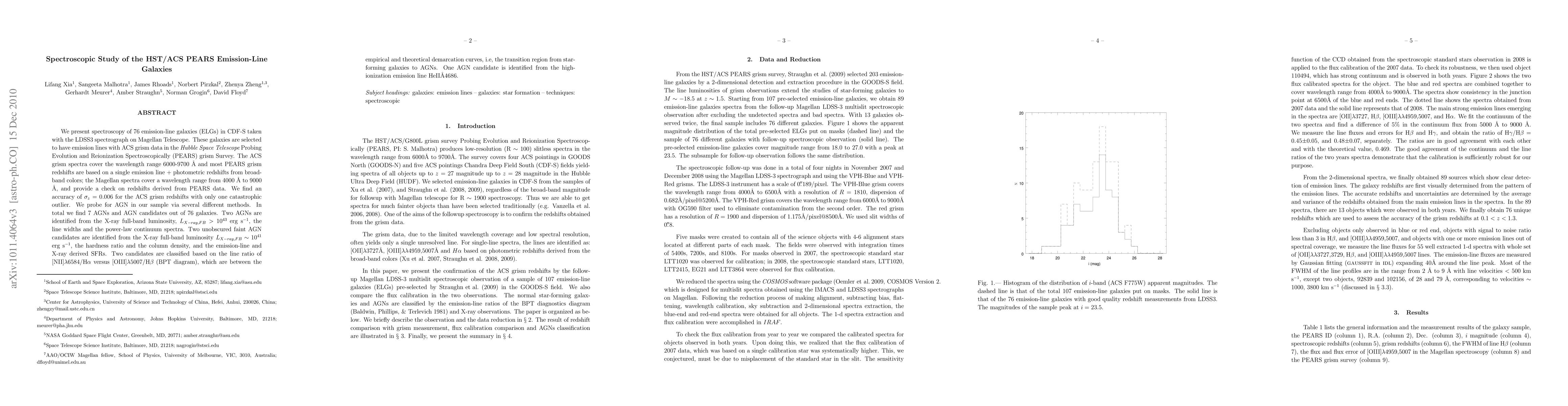 This study investigates 76 emission-line galaxies using LDSS3 spectroscopy on the Magellan Telescope, verifying redshifts from the PEARS Survey. The research identifies 7 AGNs and candidates, confirming the accuracy of ACS grism redshifts and exploring the transition from star-forming galaxies to AGNs.