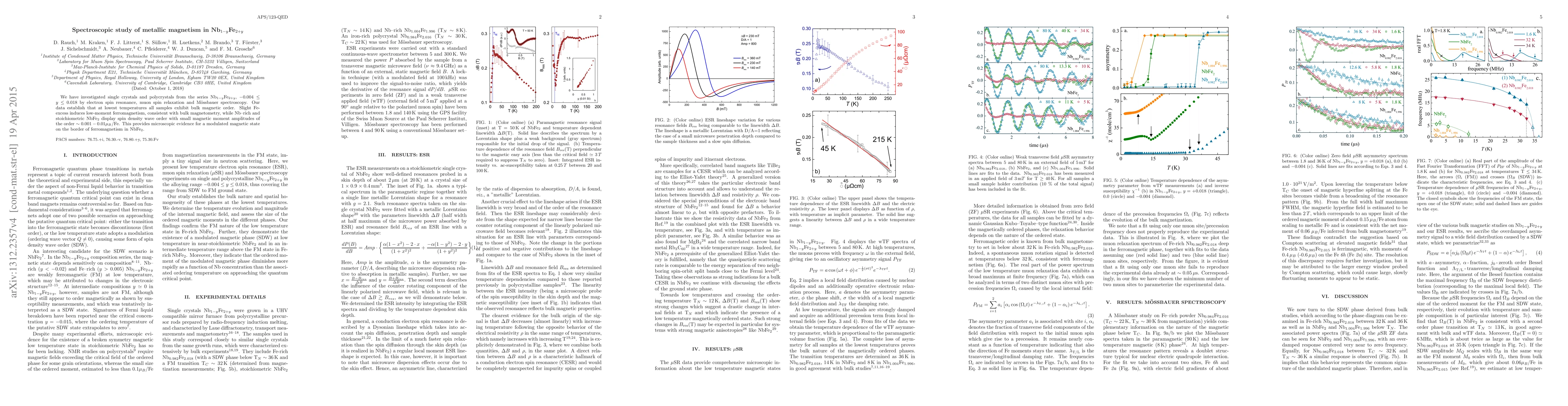 We have investigated single crystals and polycrystals from the series Nb$_{1-y}$Fe$_{2+y}$, $-0.004 \leq y \leq 0.018$ by electron spin resonance, muon spin relaxation and M\"ossbauer spectroscopy. Our data establish that at lowest temperatures all samples exhibit bulk magnetic order. Slight Fe-excess induces low-moment ferromagnetism, consistent with bulk magnetometry ($\simeq 0.06 ~\mu_B/{\rm Fe}$), Nb--rich and stoichiometric NbFe$_2$ display spin density wave order with small magnetic moment amplitudes of the order $\sim 0.001 - 0.01 ~\mu_B/{\rm Fe}$. This provides microscopic evidence for a modulated magnetic state on the border of ferromagnetism in NbFe$_2$.