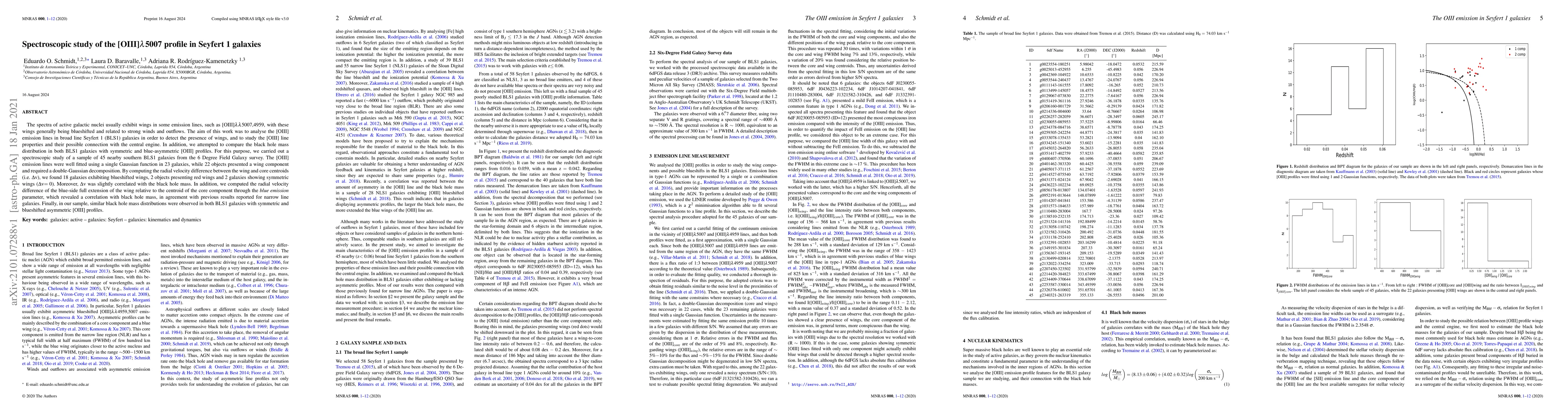 The spectra of active galactic nuclei usually exhibit wings in some emission lines, such as [OIII]$\lambda\lambda$5007,4959, with these wings generally being blueshifted and related to strong winds and outflows. The aim of this work was to analyse the [OIII] emission lines in broad line Seyfert 1 (BLS1) galaxies in order to detect the presence of wings, and to study the [OIII] line properties and their possible connection with the central engine. In addition, we attempted to compare the black hole mass distribution in both BLS1 galaxies with symmetric and blue-asymmetric [OIII] profiles. For this purpose, we carried out a spectroscopic study of a sample of 45 nearby southern BLS1 galaxies from the 6 Degree Field Galaxy survey. The [OIII] emission lines were well fitted using a single Gaussian function in 23 galaxies, while 22 objects presented a wing component and required a double-Gaussian decomposition. By computing the radial velocity difference between the wing and core centroids (i.e. $\Delta$v), we found 18 galaxies exhibiting blueshifted wings, 2 objects presenting red wings and 2 galaxies showing symmetric wings ($\Delta$v$= 0$). Moreover, $\Delta$v was slightly correlated with the black hole mass. In addition, we computed the radial velocity difference of the blue-side full extension of the wing relative to the centroid of the core component through the \emph{blue emission} parameter, which revealed a correlation with black hole mass, in agreement with previous results reported for narrow line galaxies. Finally, in our sample, similar black hole mass distributions were observed in both BLS1 galaxies with symmetric and blueshifted asymmetric [OIII] profiles.