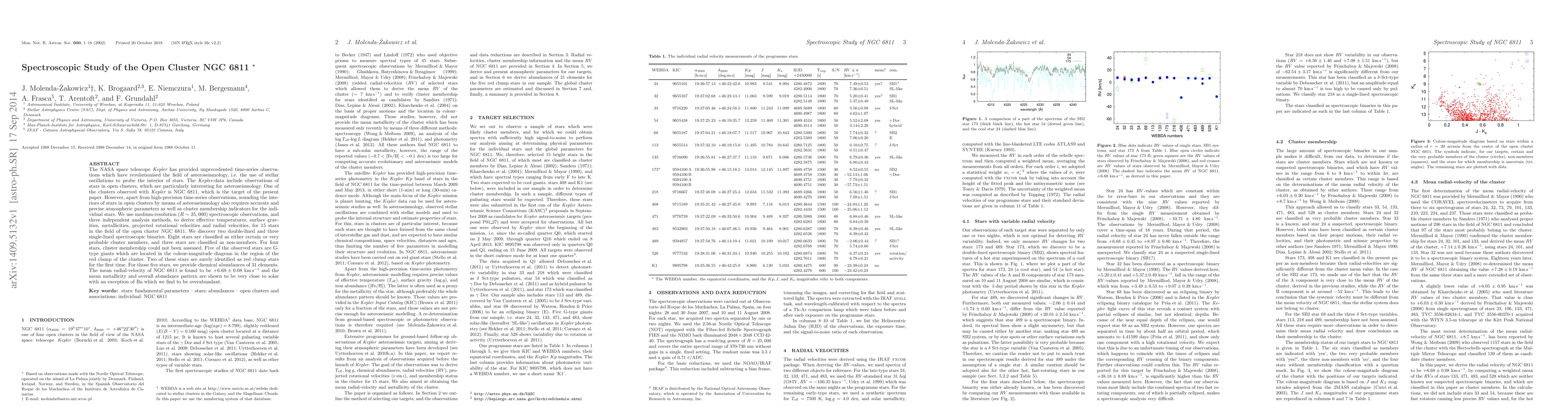 This paper uses spectroscopic observations to analyze 15 stars in the open cluster NGC 6811, identifying eight probable cluster members and determining atmospheric parameters and chemical abundances for these stars. The study reveals two double-lined and three single-lined spectroscopic binaries, and finds that five G-type giants are red clump stars, with Ba being notably overabundant.