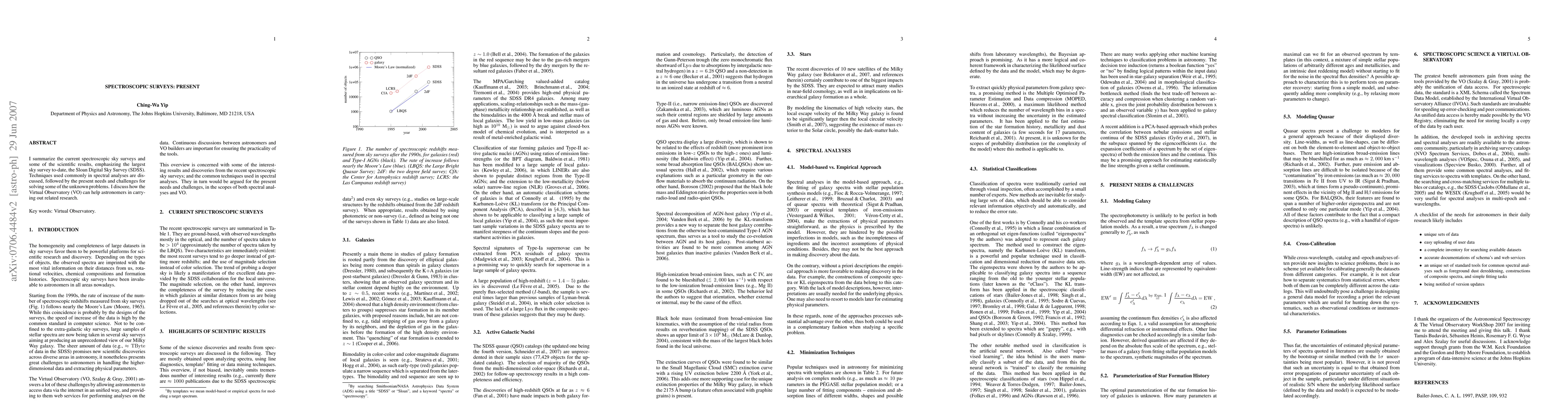 I summarize the current spectroscopic sky surveys and some of the scientific results, emphasizing the largest sky survey to-date, the Sloan Digital Sky Survey (SDSS). Techniques used commonly in spectral analyses are discussed, followed by the present needs and challenges for solving some of the unknown problems. I discuss how the Virtual Observatory (VO) can help astronomers in carrying out related research.