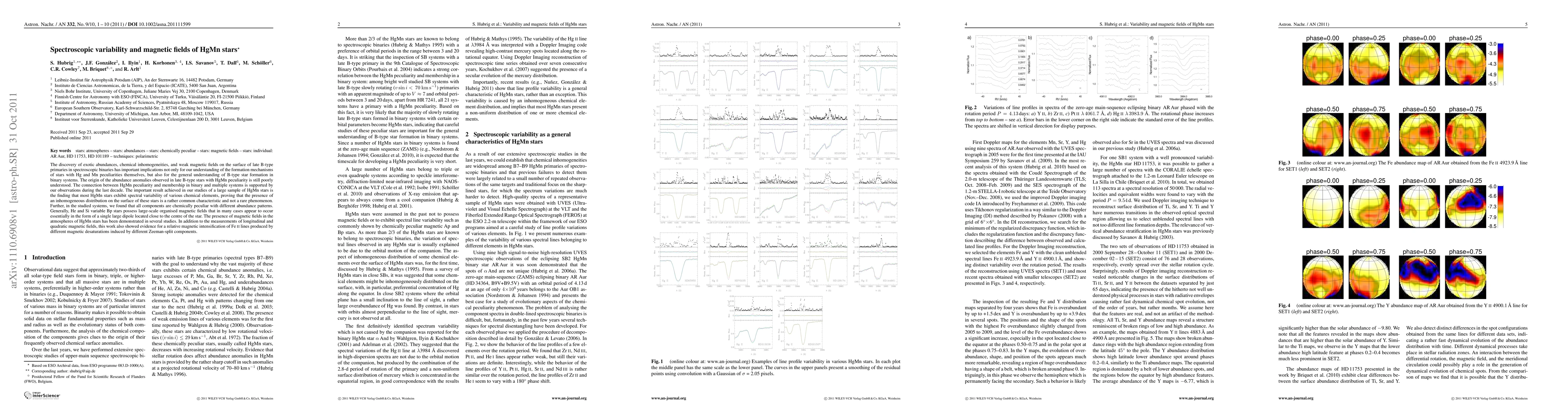 This paper explores the spectroscopic variability and magnetic fields of HgMn stars, revealing that spectral variability of various chemical elements is common among these stars, indicating surface inhomogeneities. It also demonstrates the presence of magnetic fields in HgMn stars, contributing to the understanding of their formation and the broader context of B-type star formation in binary systems.