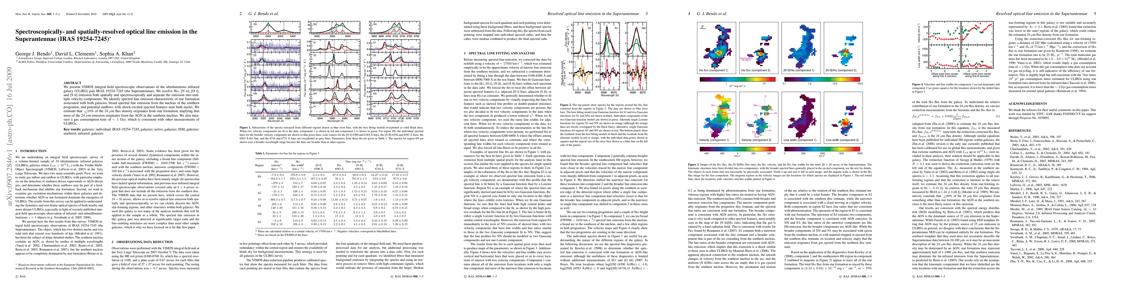 We present VIMOS integral field spectroscopic observations of the ultraluminous infrared galaxy (ULIRG) pair IRAS 19254-7245 (the Superantennae). We resolve H alpha, [N II], [O I], and [S II] emission both spatially and spectroscopically and separate the emission into multiple velocity components. We identify spectral line emission characteristic of star formation associated with both galaxies, broad spectral line emission from the nucleus of the southern progenitor, and potential outflows with shock-excited spectral features near both nuclei. We estimate that <~10% of the 24 micron flux density originates from star formation, implying that most of the 24 micron emission originates from the AGN in the southern nucleus. We also measure a gas consumption time of ~1 Gyr, which is consistent with other measurements of ULIRGs.